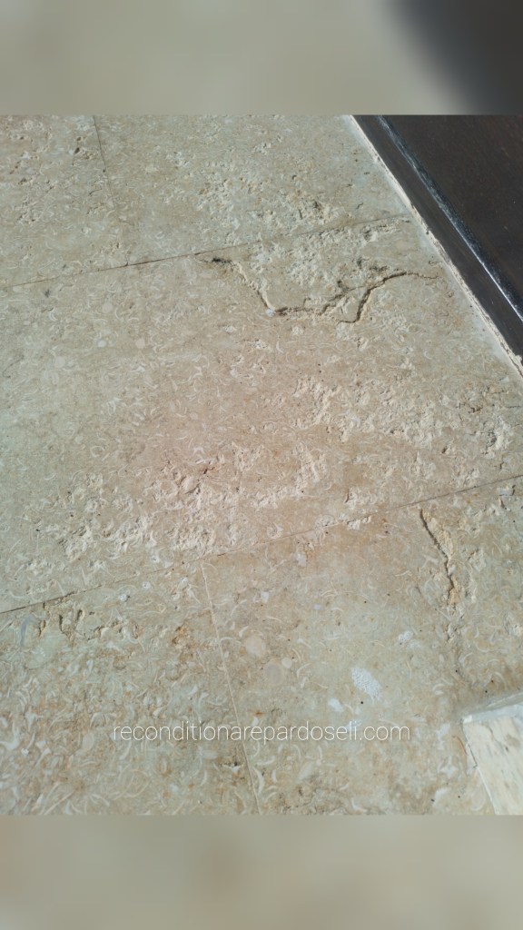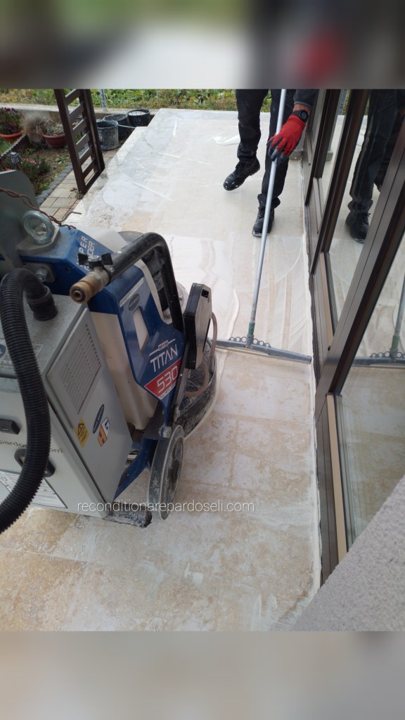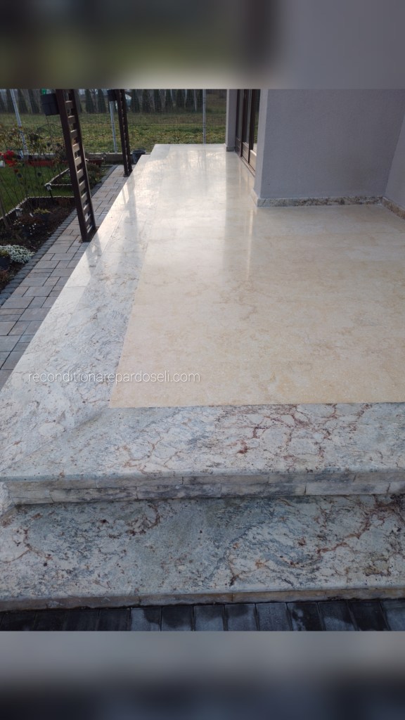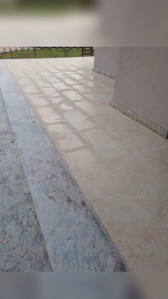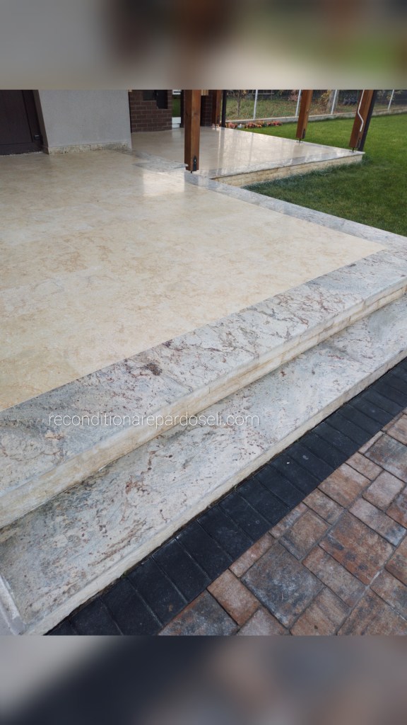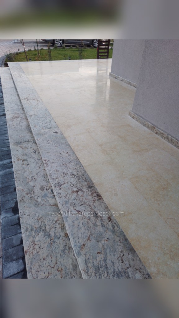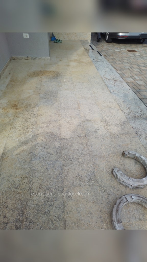 Lucrare travertin, pardoseala noua, slefuita pentru planeizare, chituire si eliminare zgarieturi de la montaj, refinisata lucios: