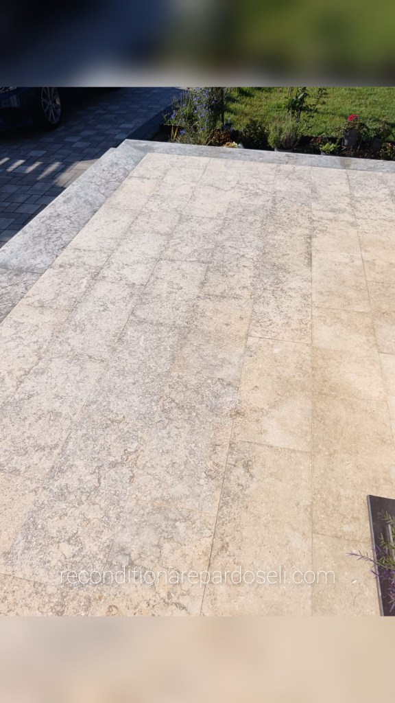 Exemplu de travertin, terasa exterioara. Slefuita si planeizata, finisaj mat :