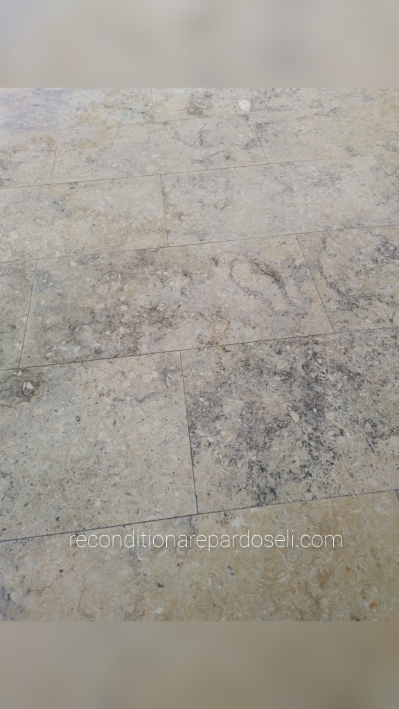Exemplu de pardoseala din calcar finisata mat satinat. Inainte a fost impregnata cu un impregnant pe baza de solvent si avea un aspect de lac sau plastic, rosturile de 2 culori diferite. Slefuita pentru o planeitate buna, taiate rosturi si schimbate. Un finisaj simplu si clasic, usor de intretinut: