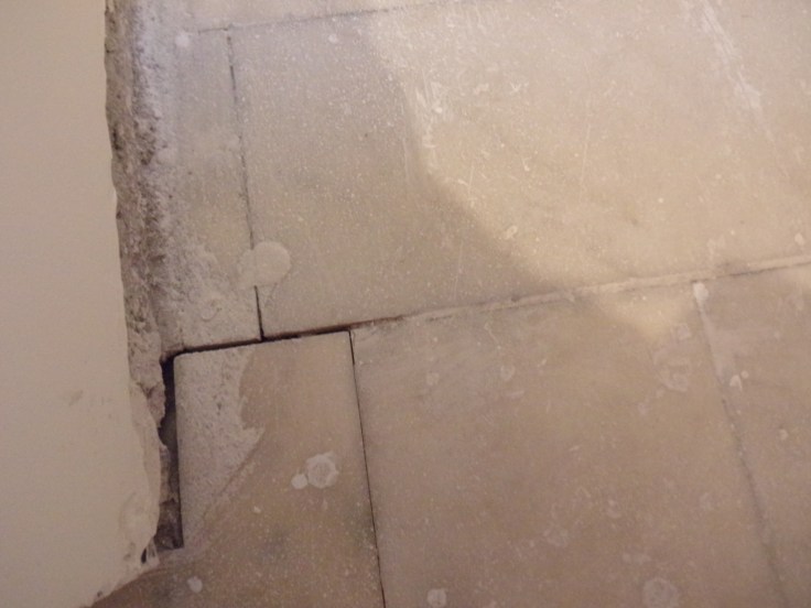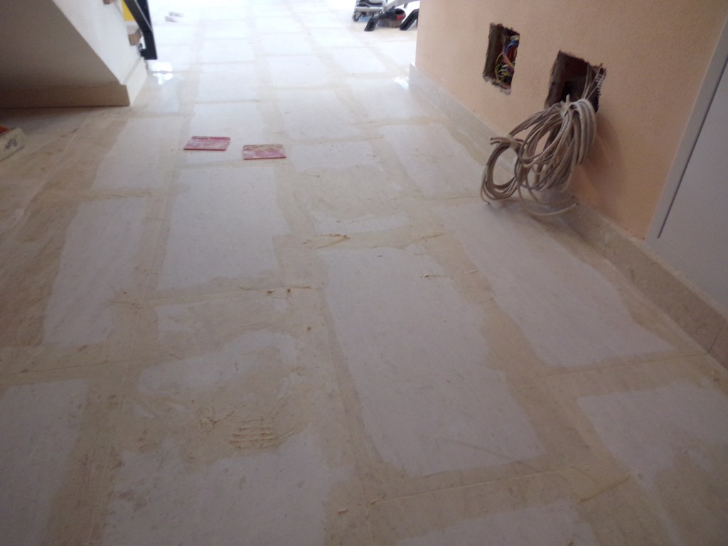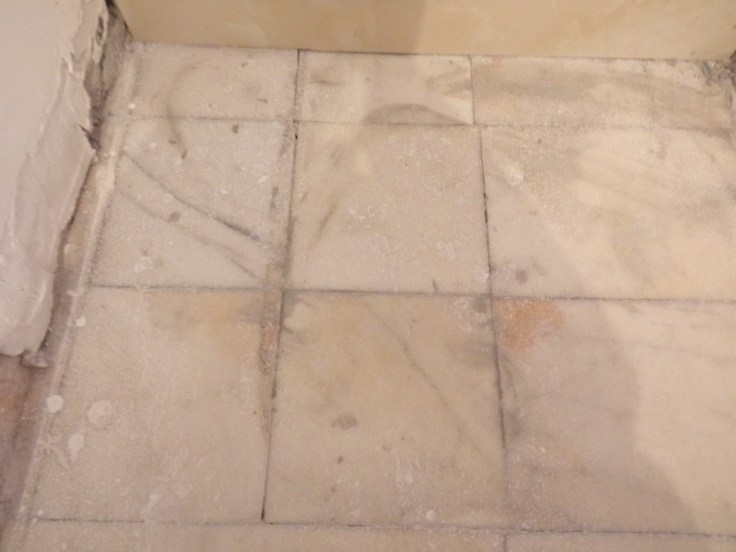 Exemplu de marmura : pardoseala veche, zgarieturi, matuire accentuata pe zone diferite si rosturi pe baza de ciment cu probleme inlocuite cu stucco.