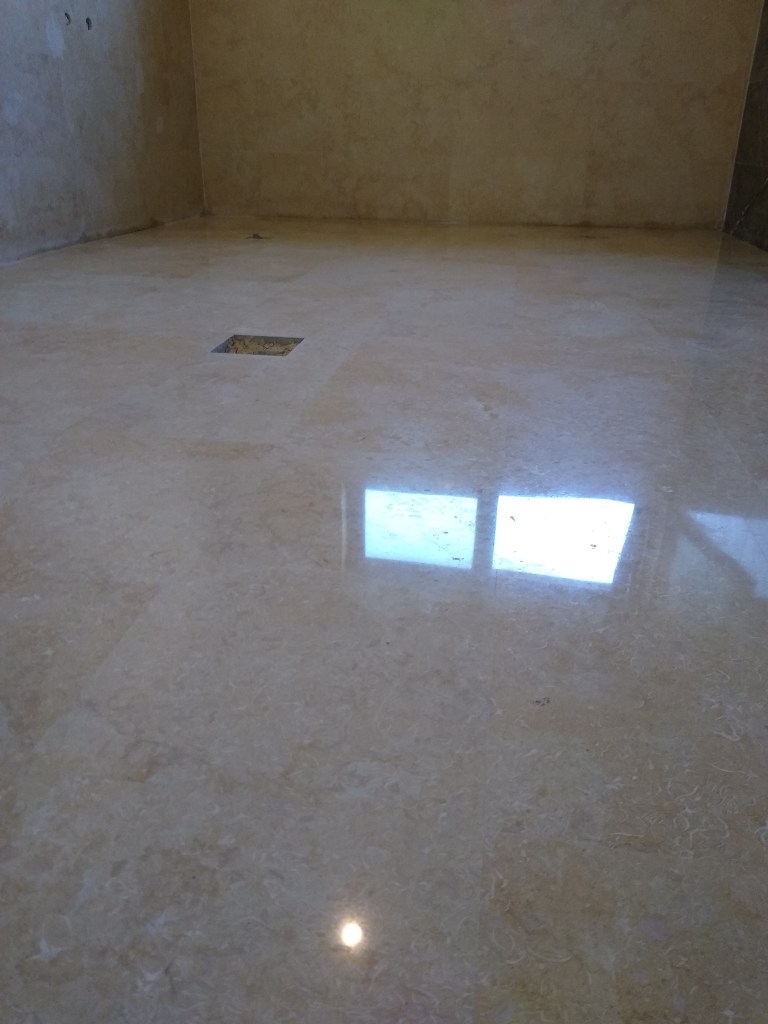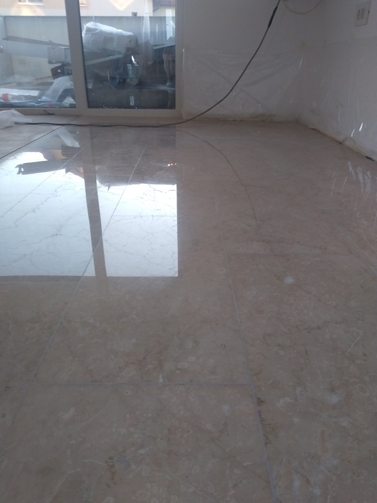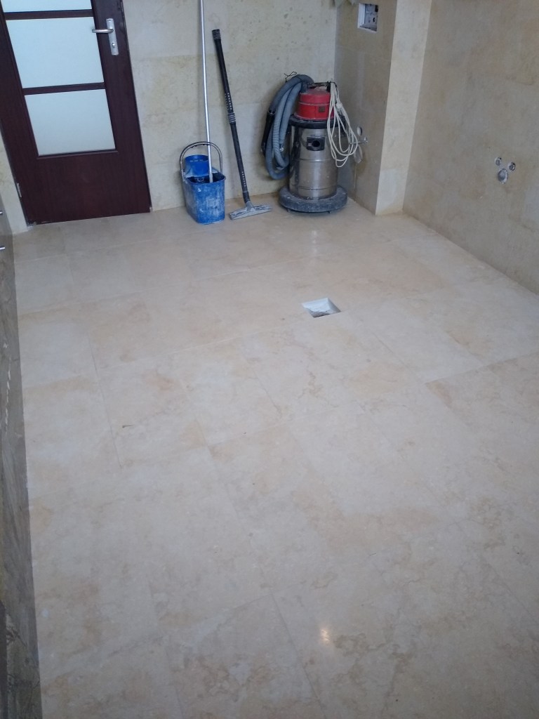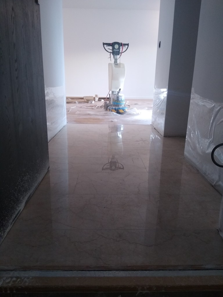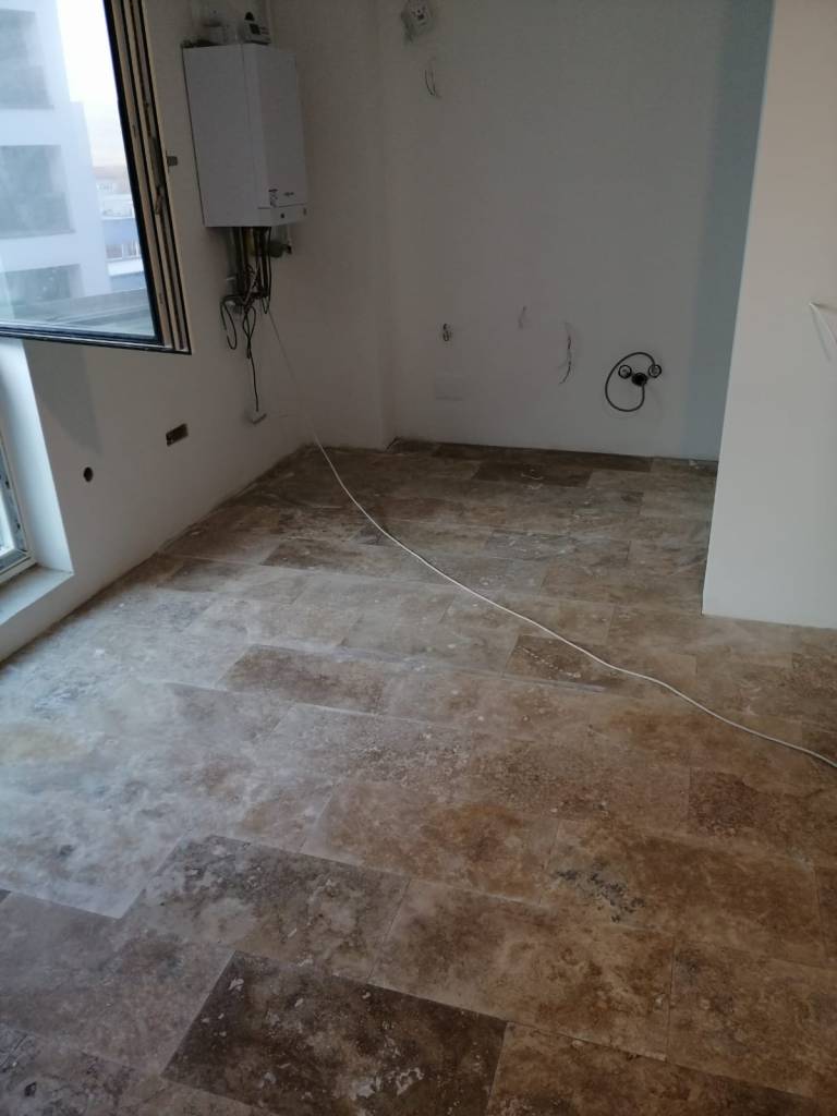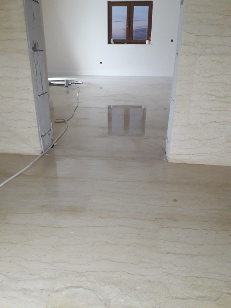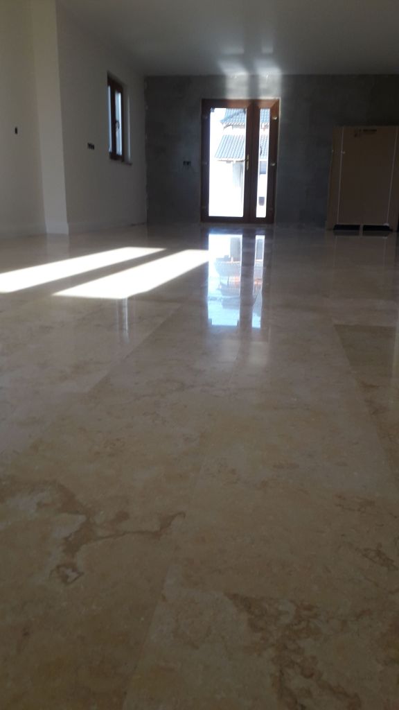 Lucrare travertin, pardoseala noua, slefuita pentru planeizare, chituire si eliminare zgarieturi de la montaj, refinisata lucios:
