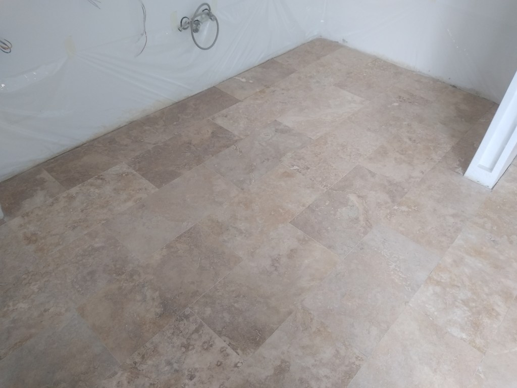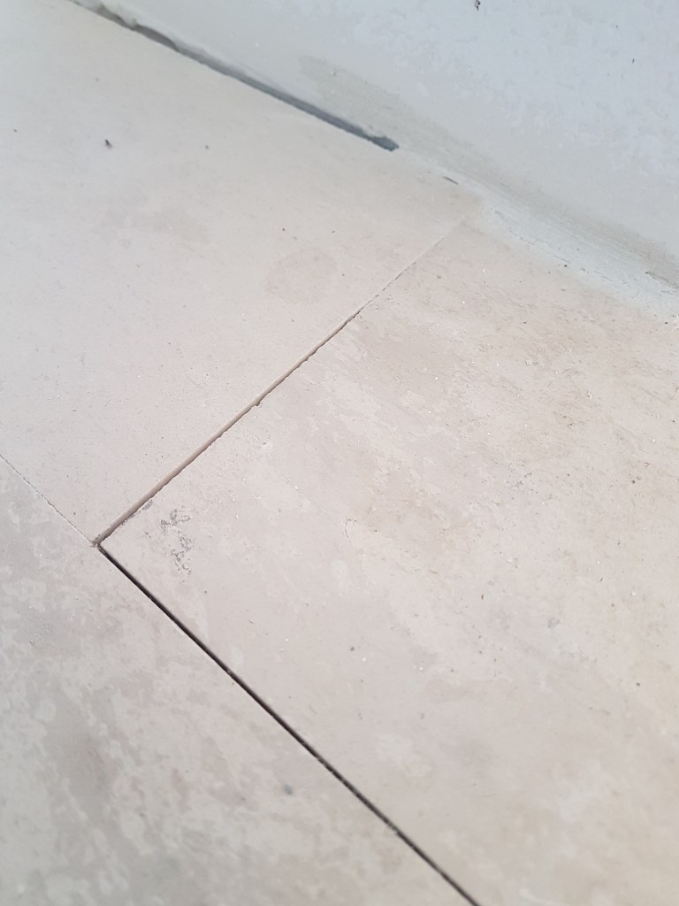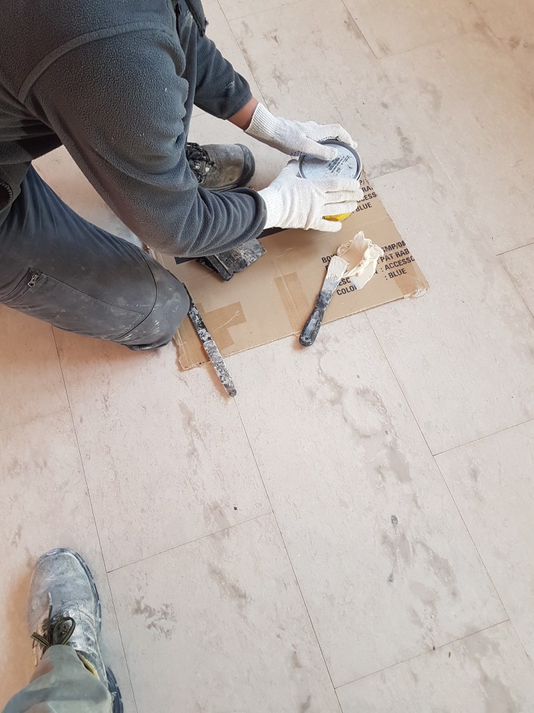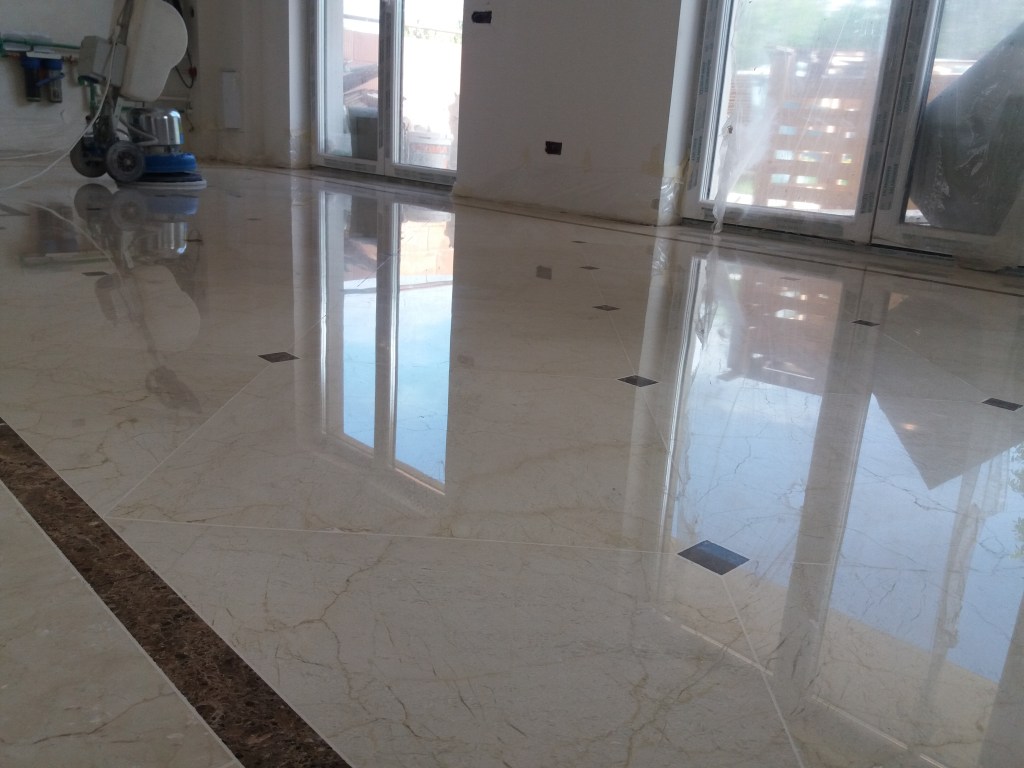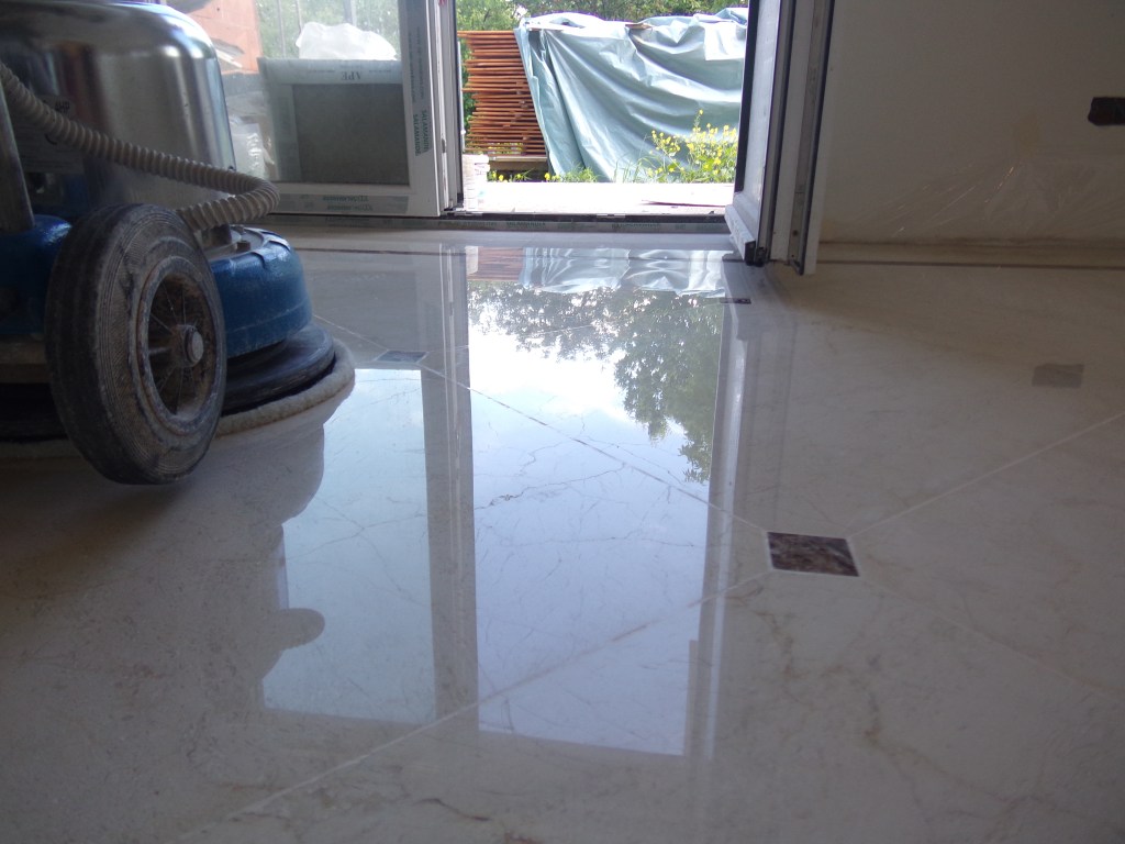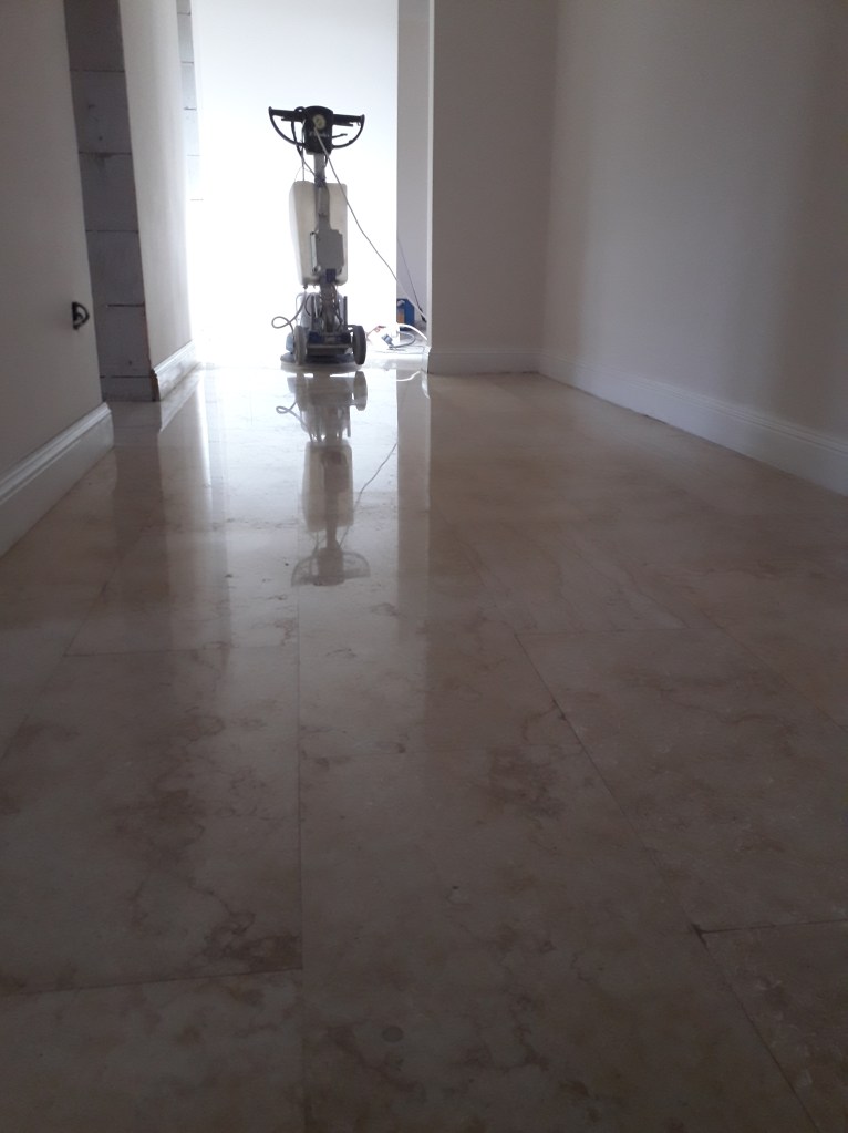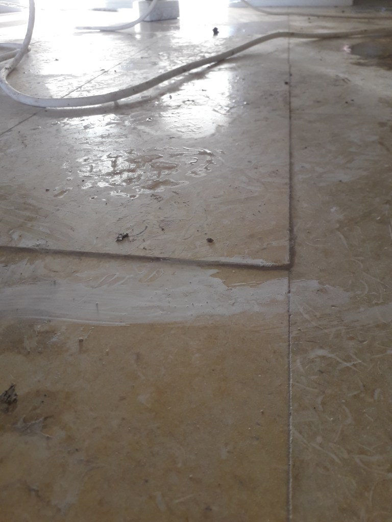 Lucrare travertin, pardoseala noua, slefuita pentru planeizare, chituire si eliminare zgarieturi de la montaj, refinisata lucios: