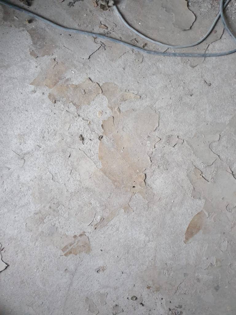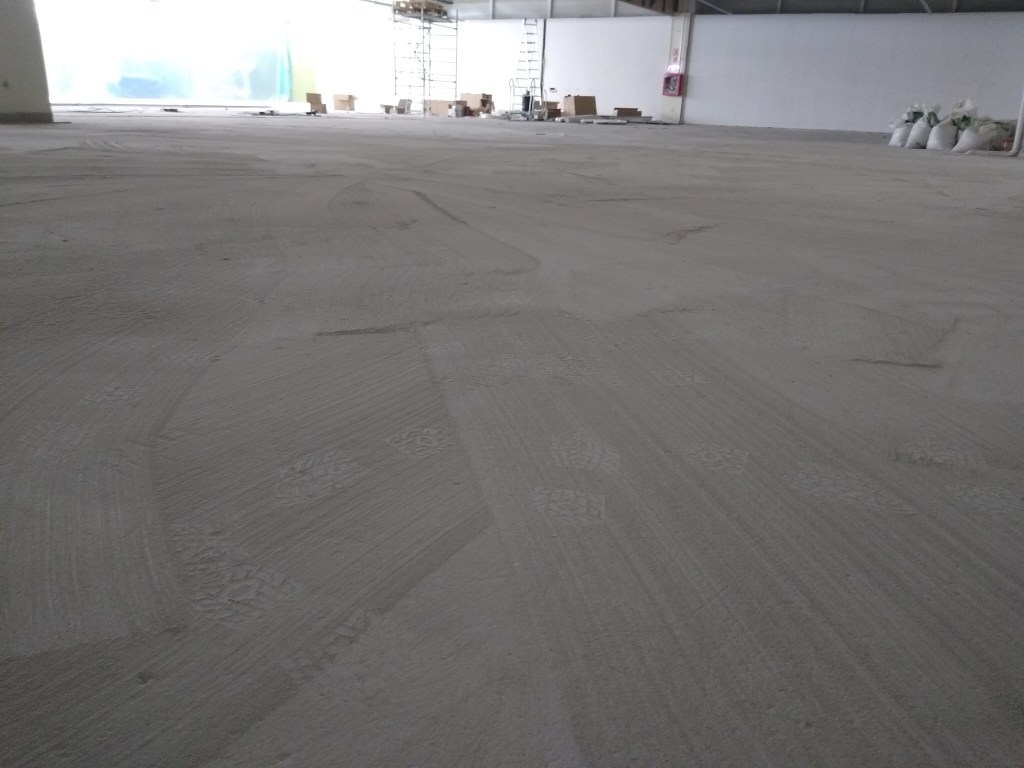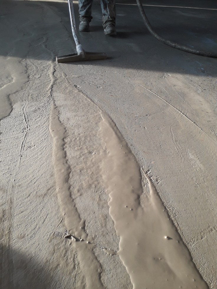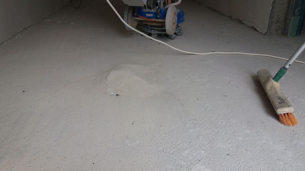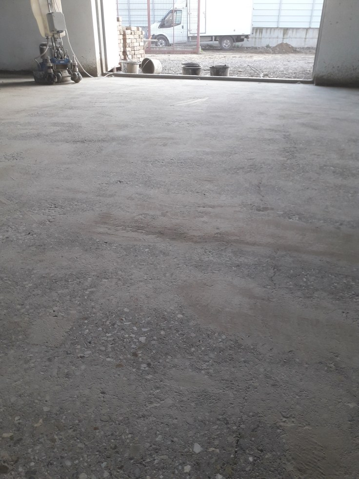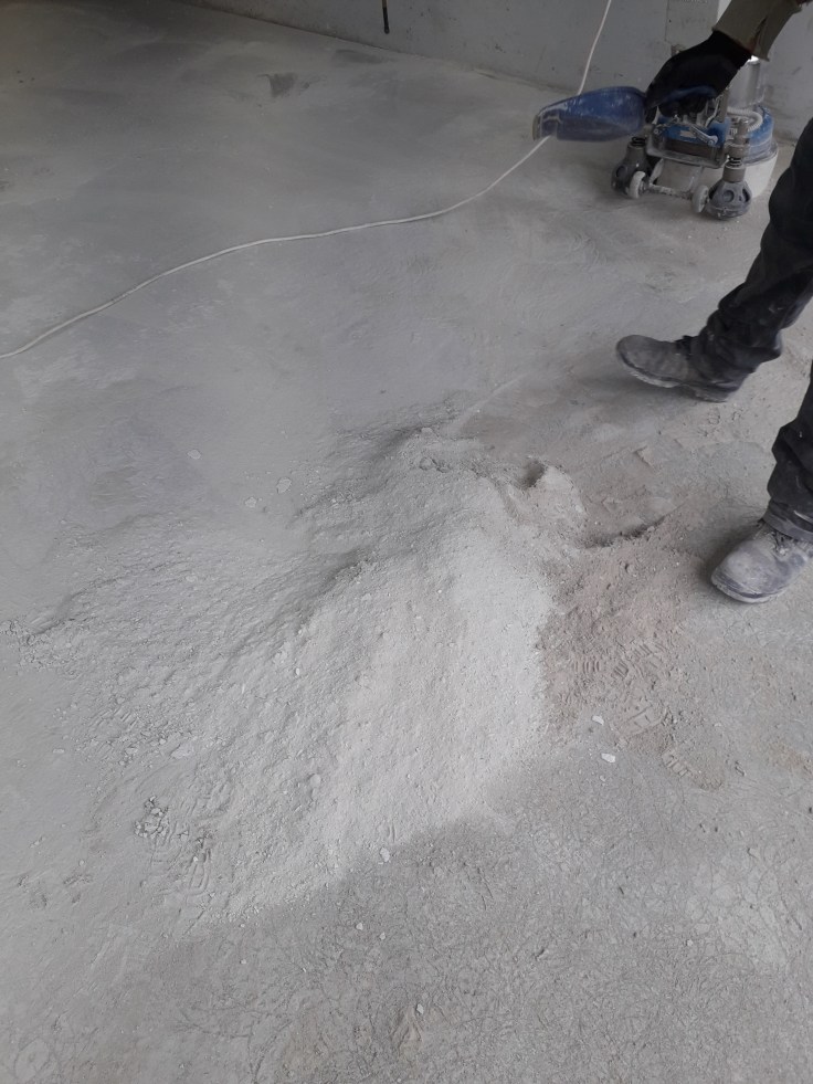 Exemplu indepartare prin slefuire a unui strat gros de autonivelanta pentru a ajunge inapoi la betonul initial :