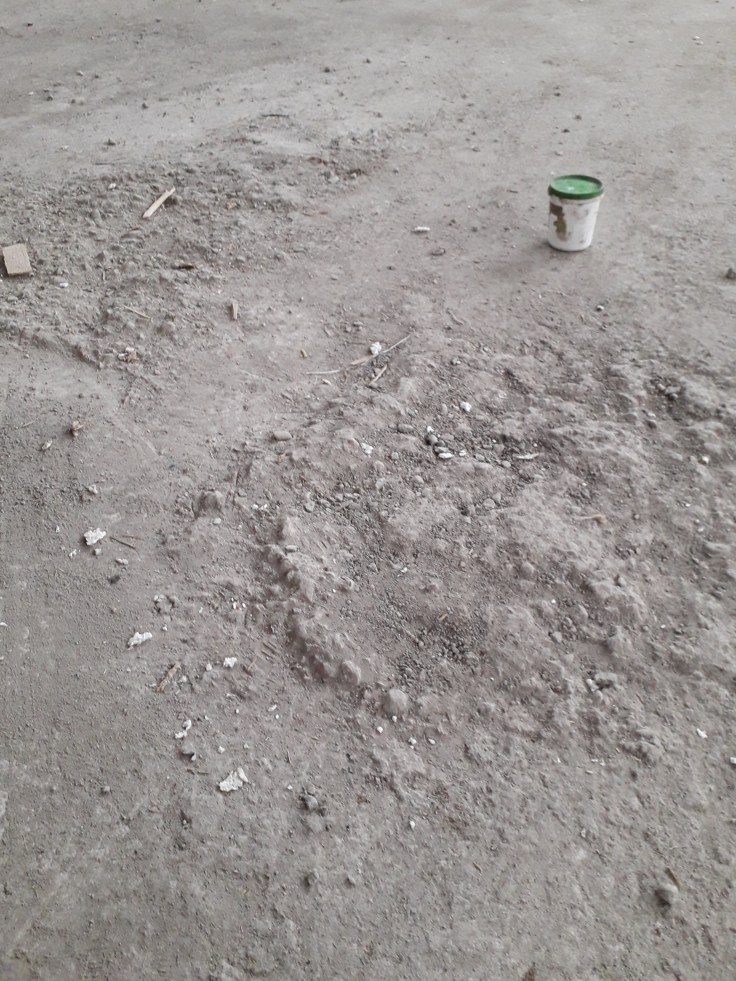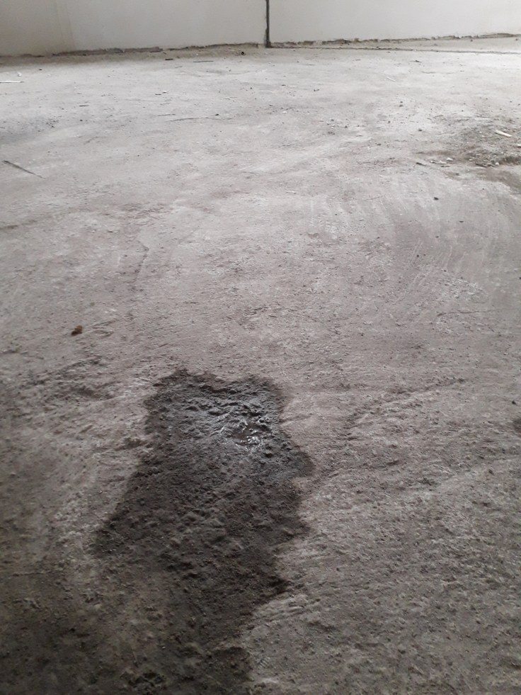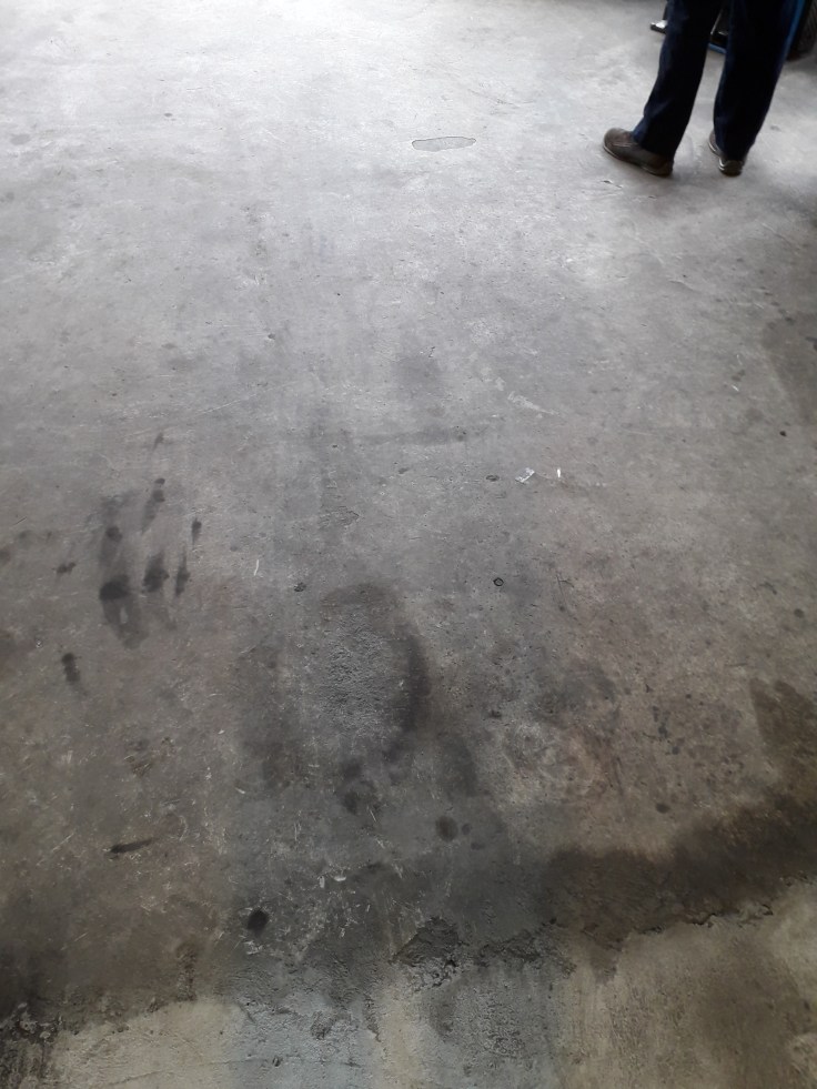Pardoseala din beton elicopterizat, cu benzi de demarcatie si urme de uzura, plus in urma renovarii si schimbarii destinatiei de utilizare era murdara si patata cu amorse, vopseluri si alte materiale :