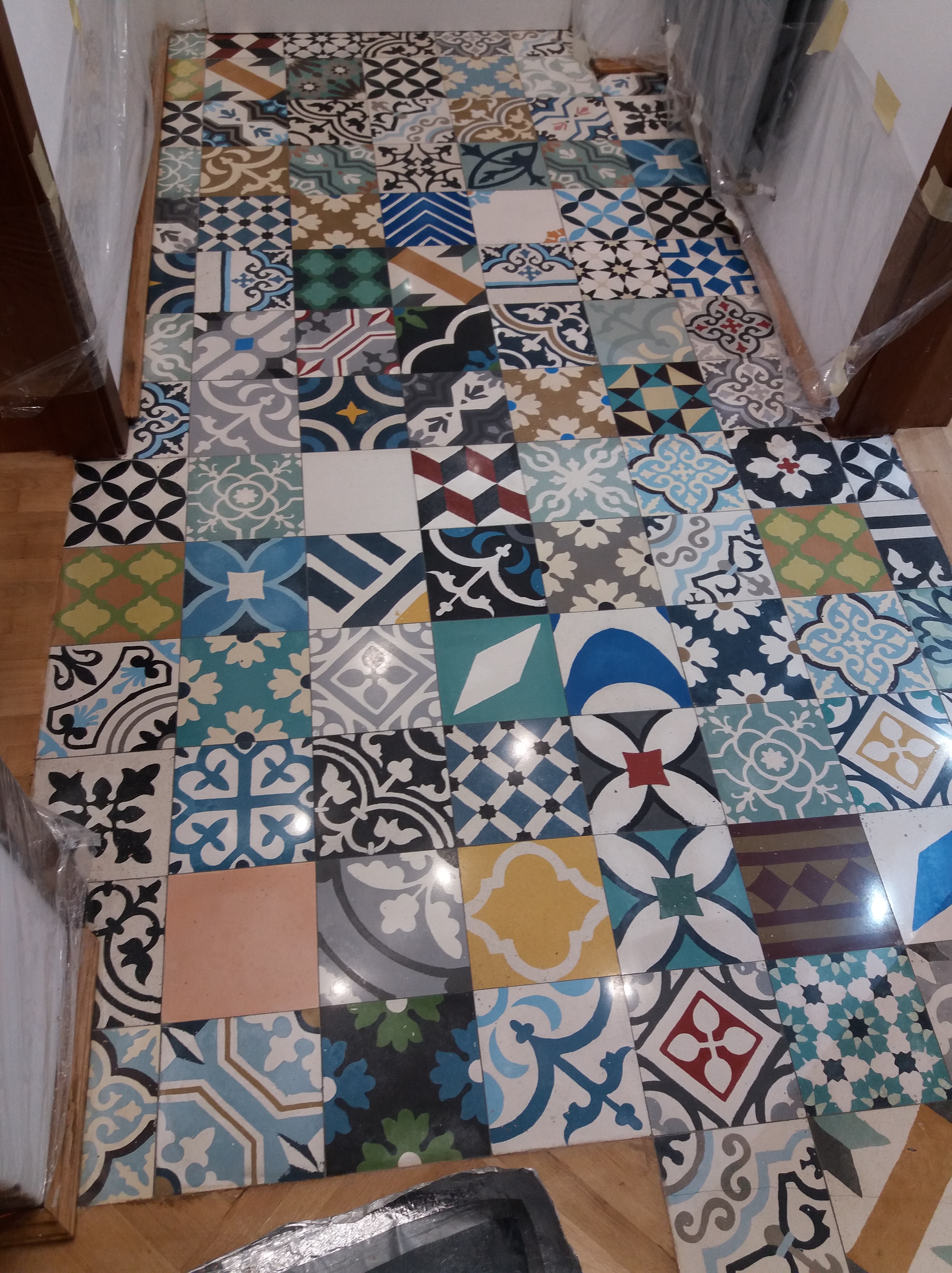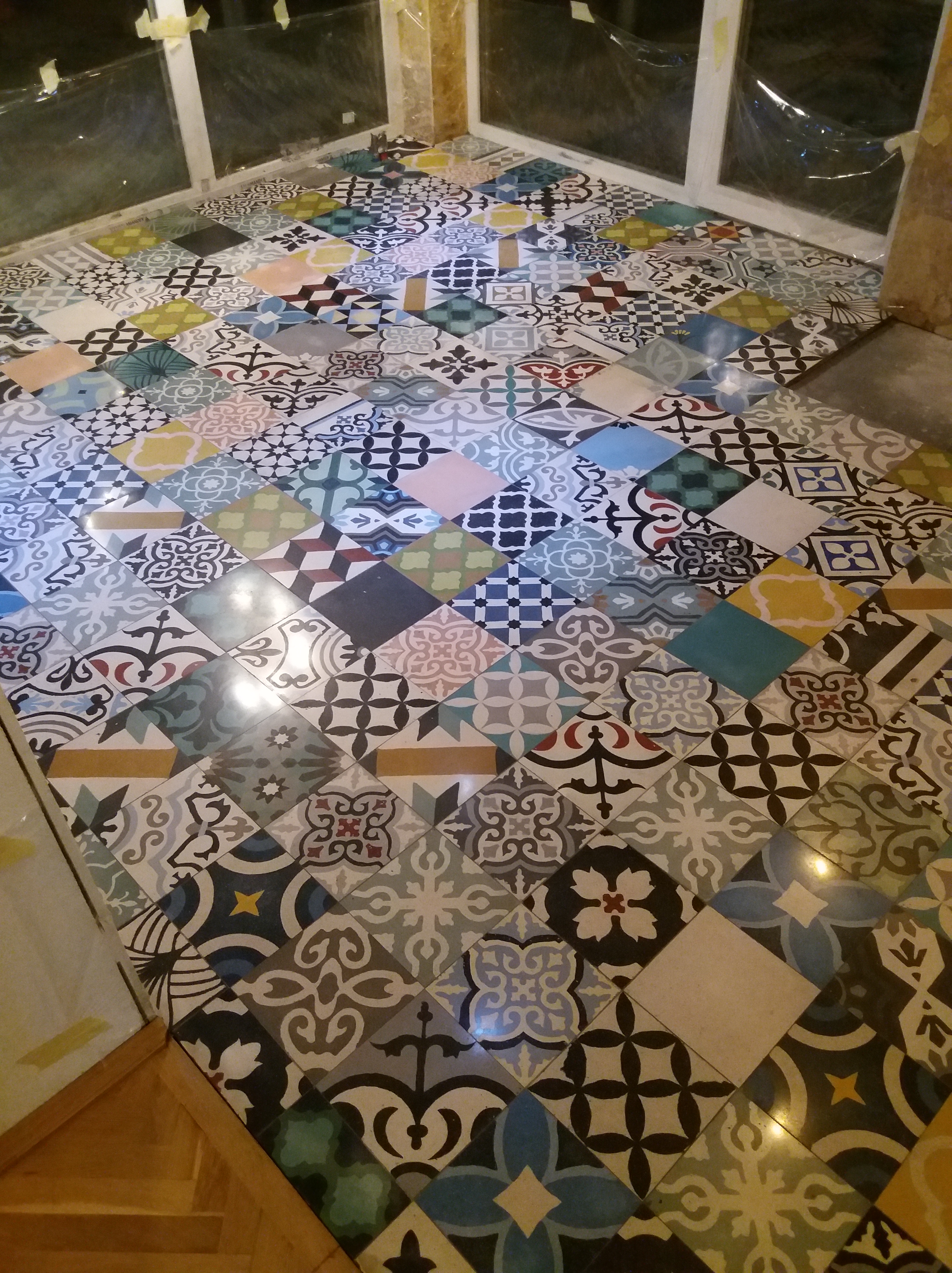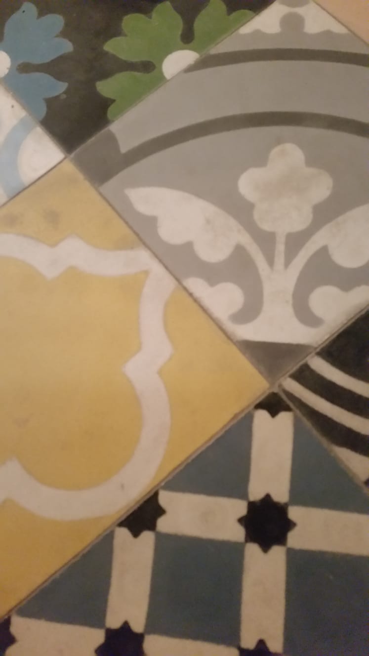 Exemplu de pardoseala realizata manual “terrazzo oriental” sau “encaustic cement tiles”. Montaj cu diferente intre placi si rosturi imperfecte :