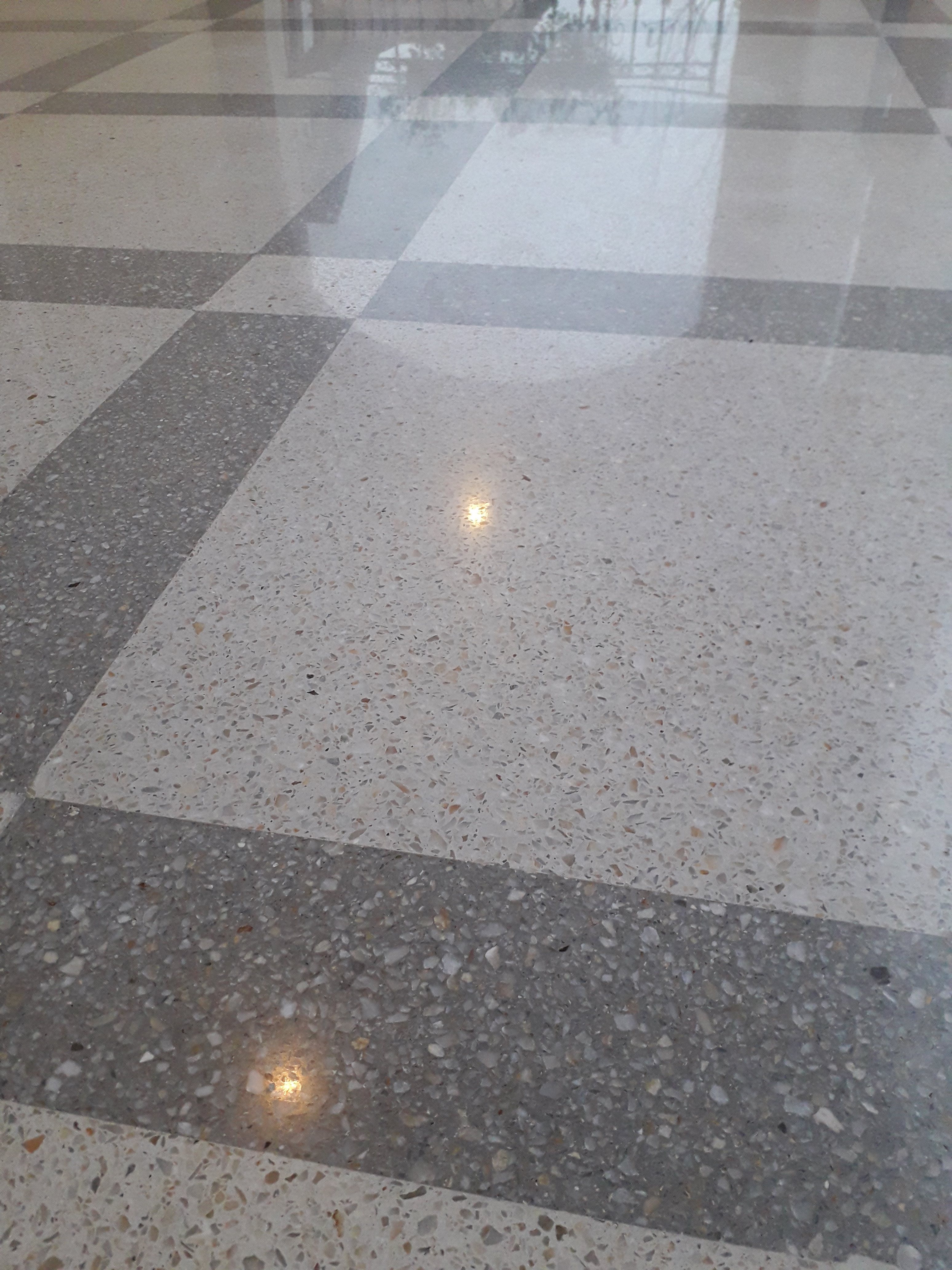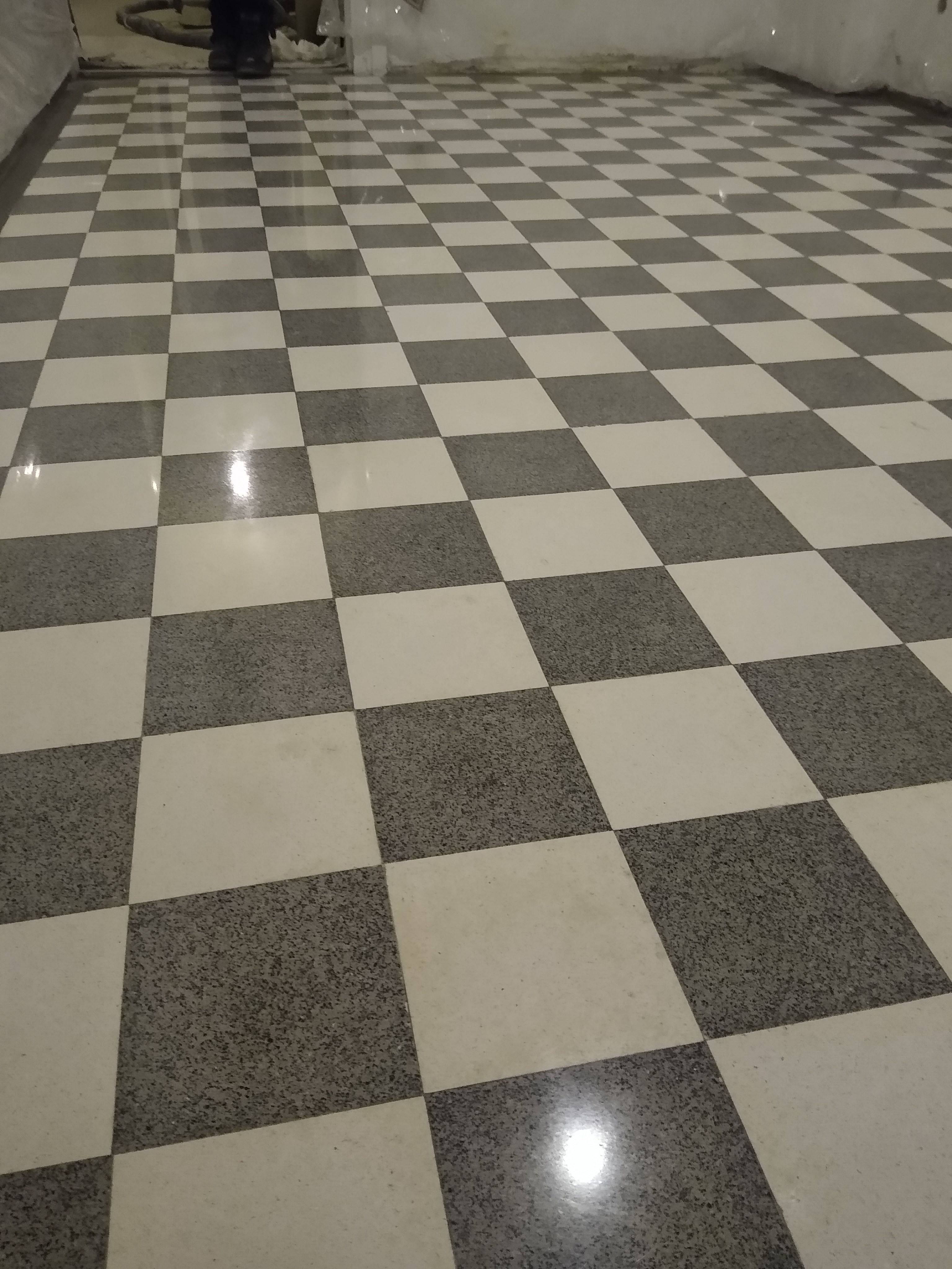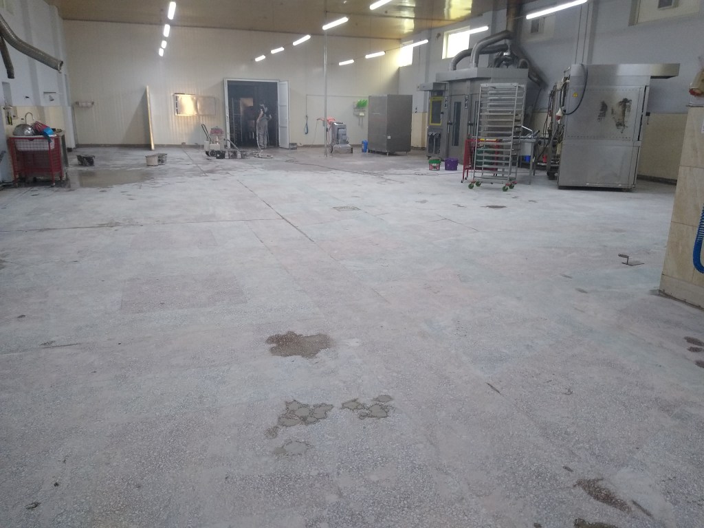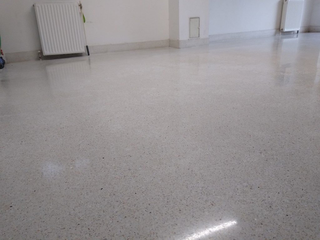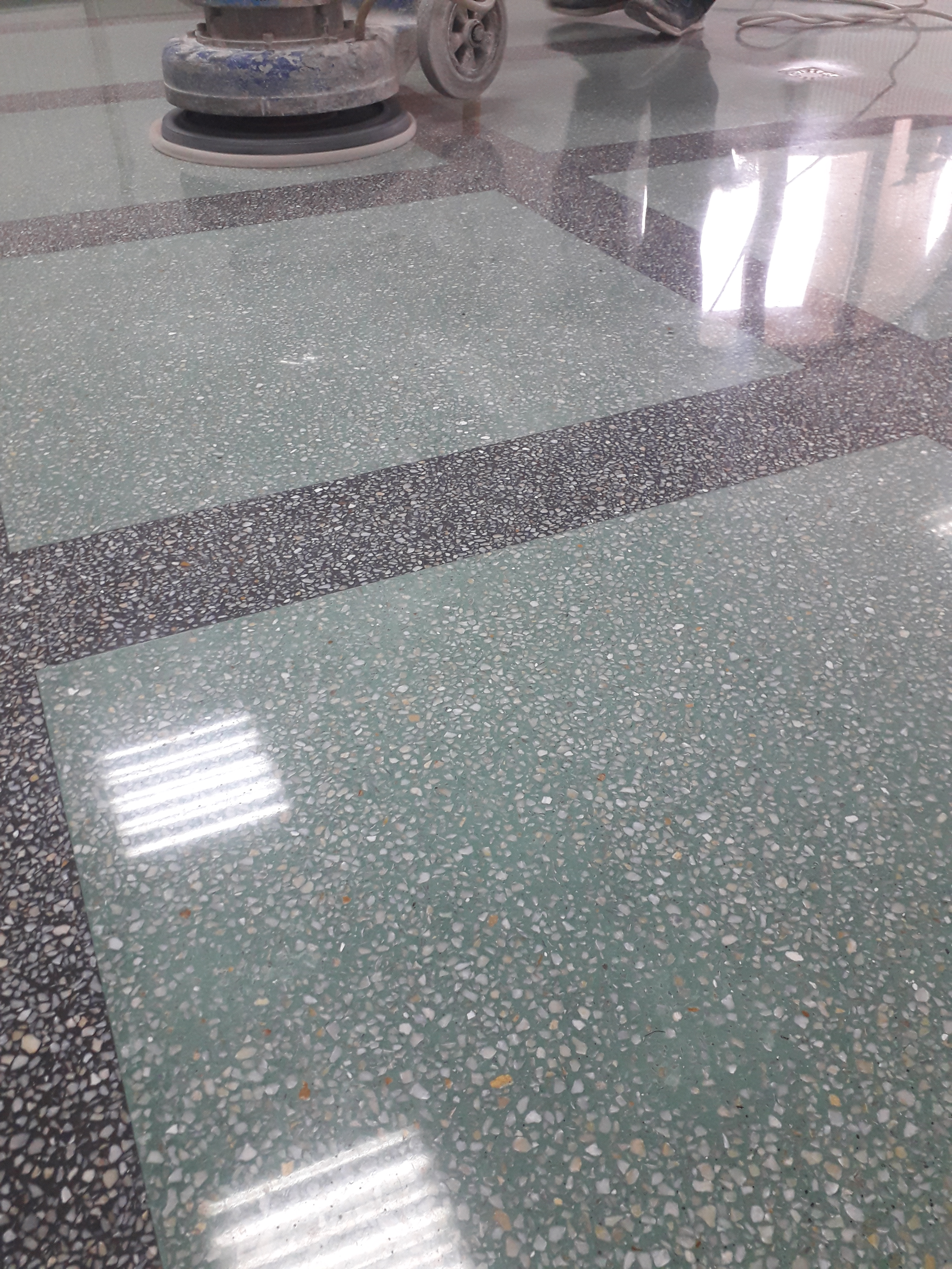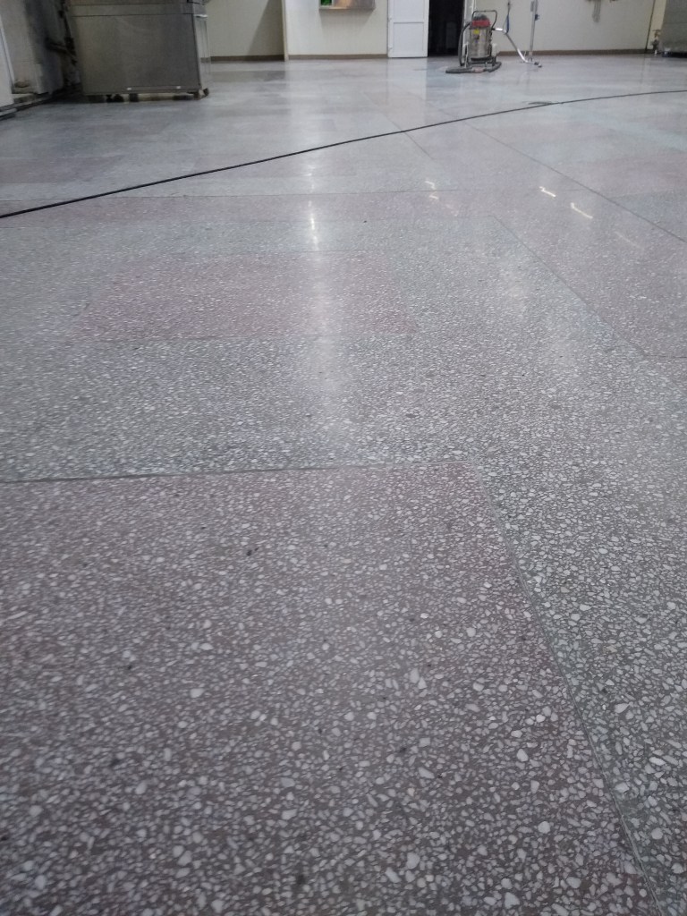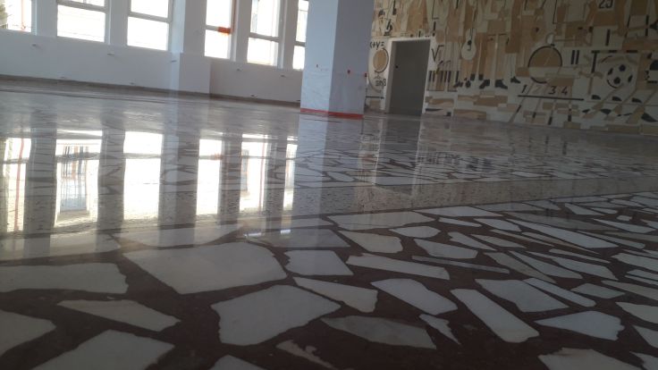 Slefuire terrazzo spaniol dupa montaj, pardoseala noua adusa din Spania. Terrazzo alb in spatiul de productie finisat mat satinat pentru intretinere usoara si terrazzo negru la intrare clienti cu finisaj lustruit :