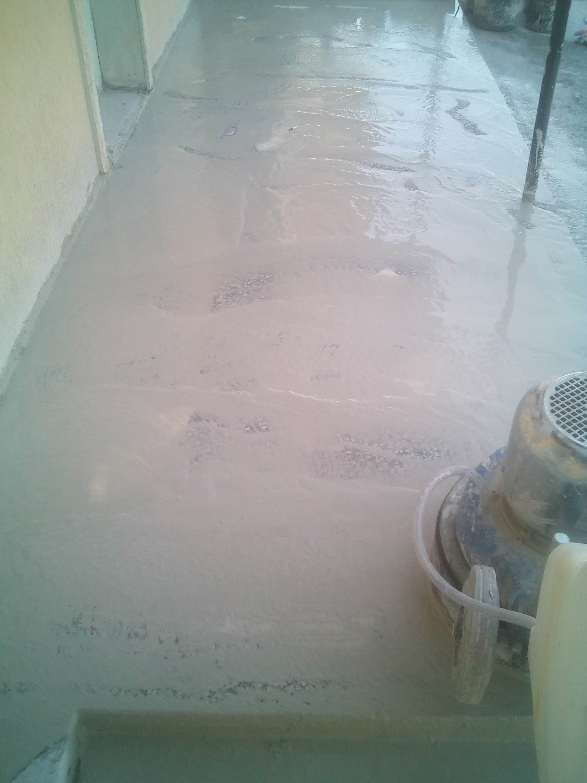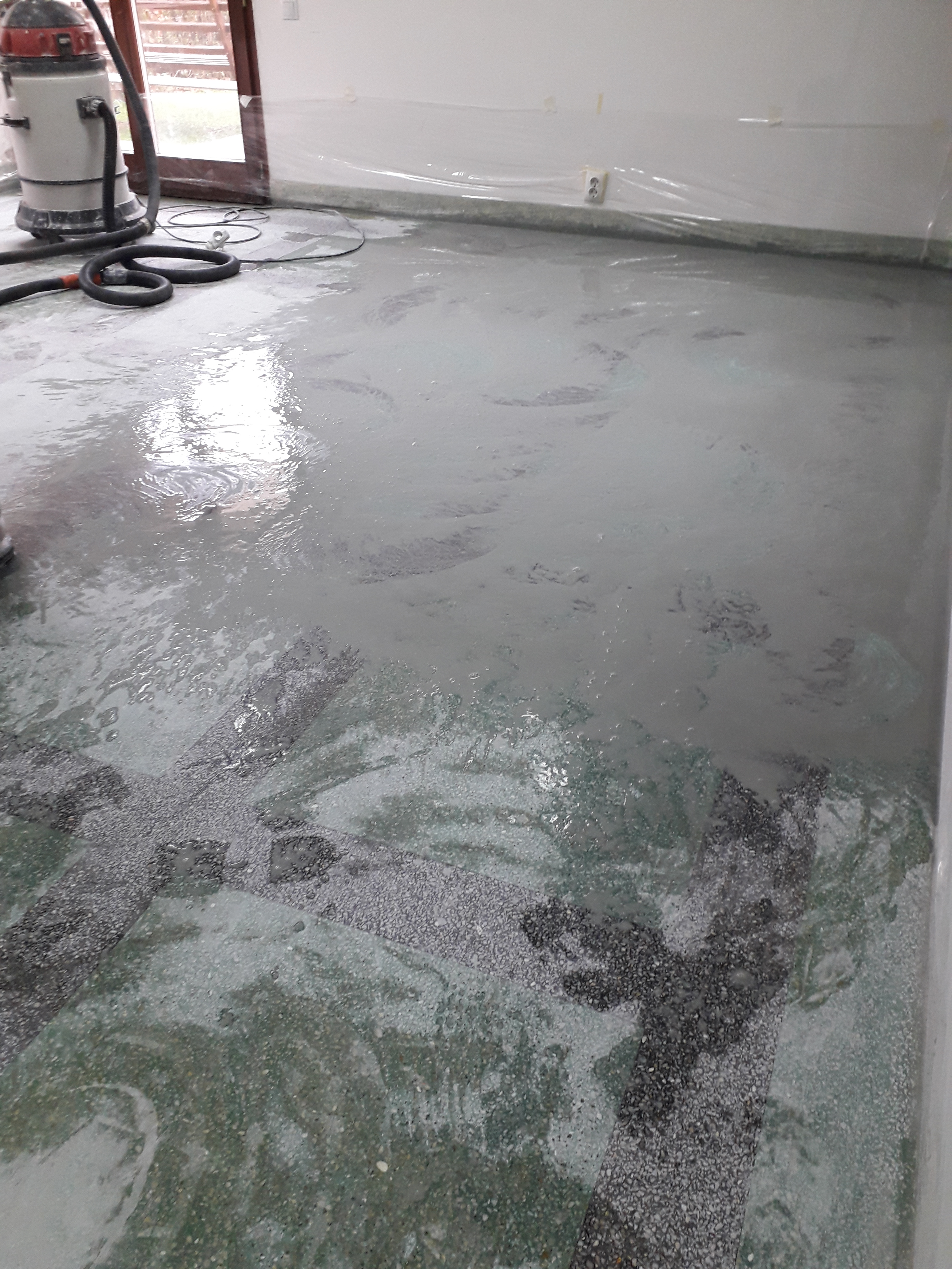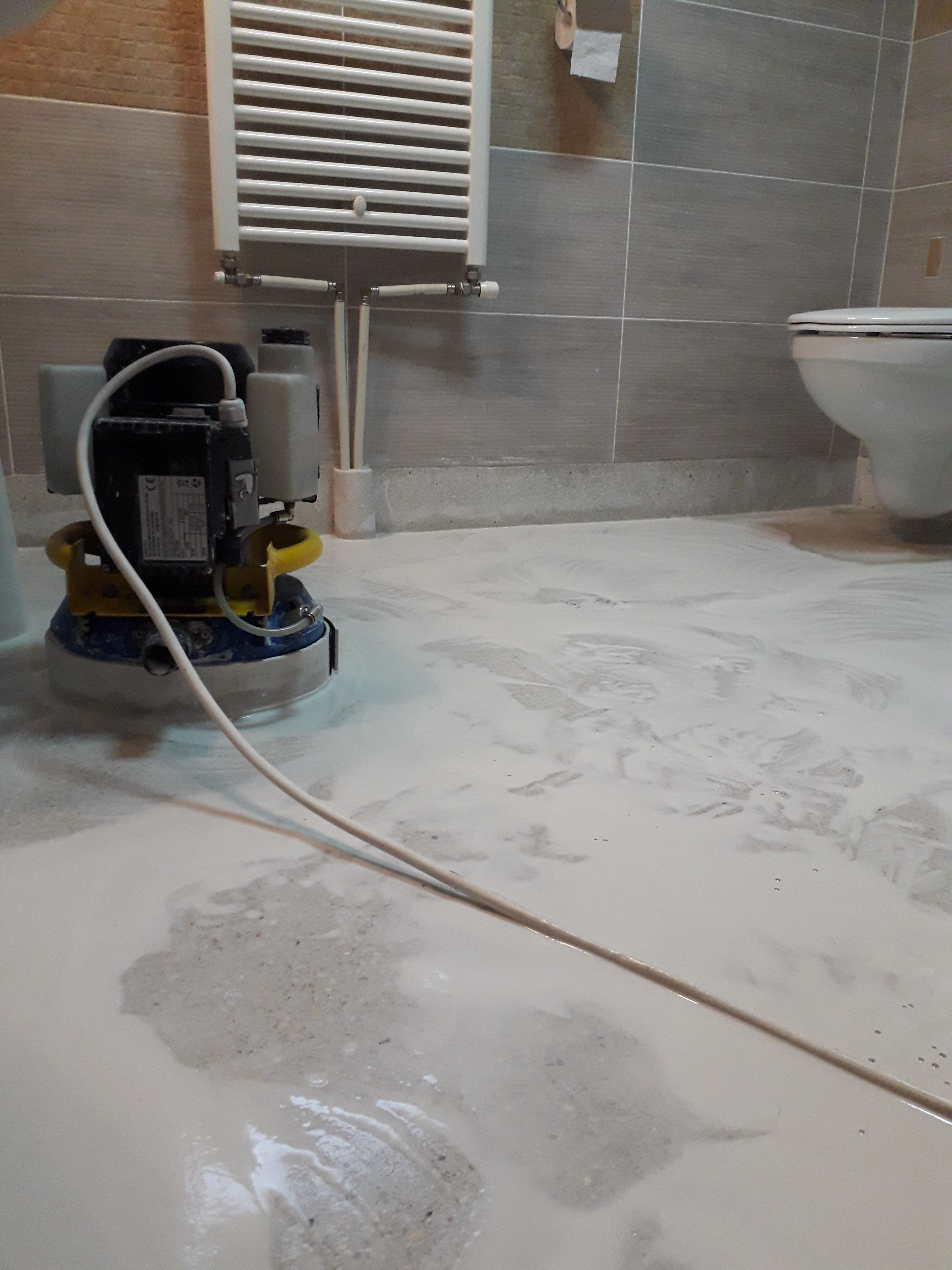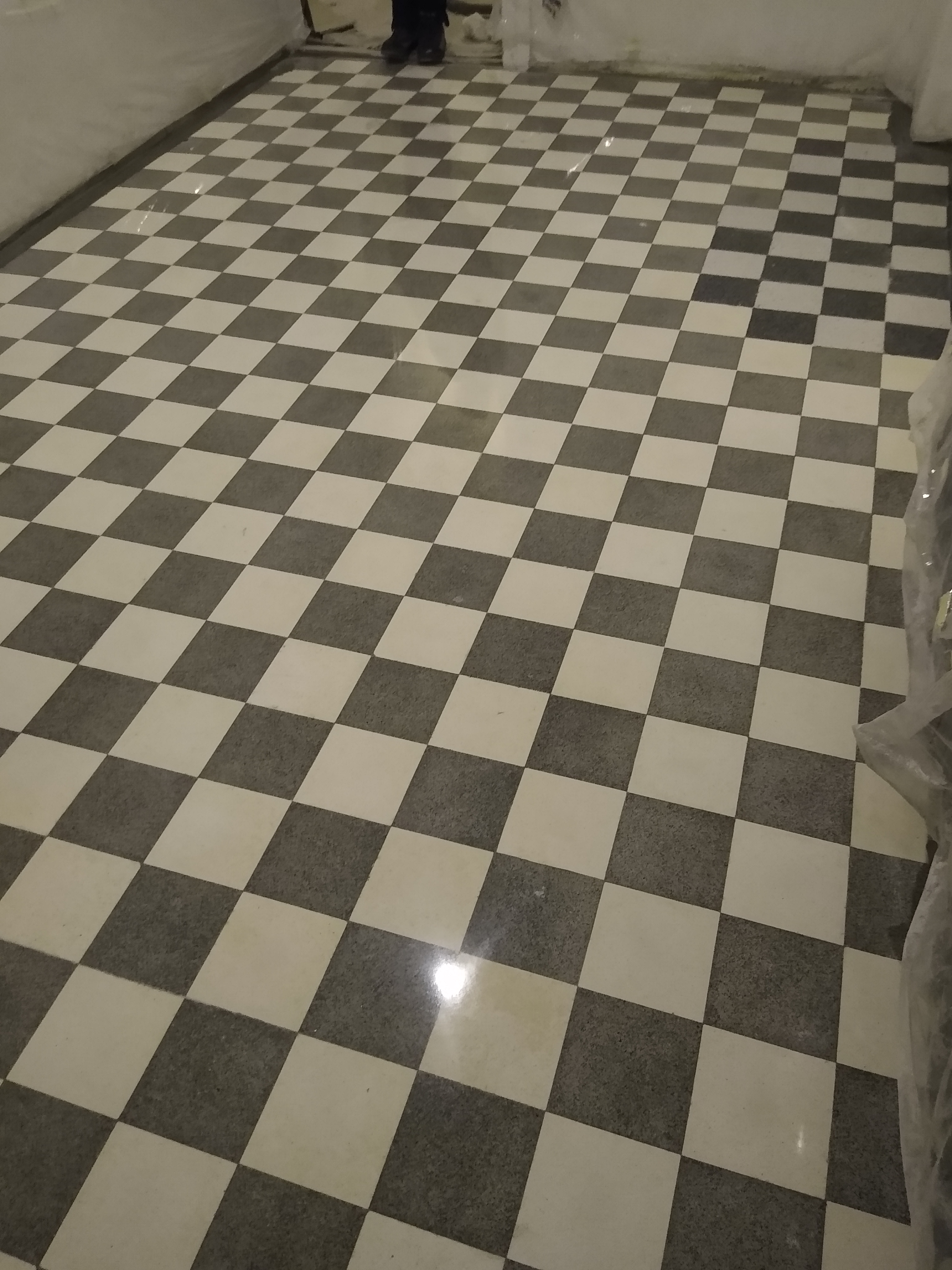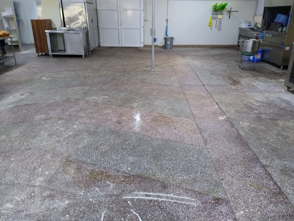 Slefuire terrazzo spaniol dupa montaj, pardoseala noua adusa din Spania. Terrazzo alb in spatiul de productie finisat mat satinat pentru intretinere usoara si terrazzo negru la intrare clienti cu finisaj lustruit :