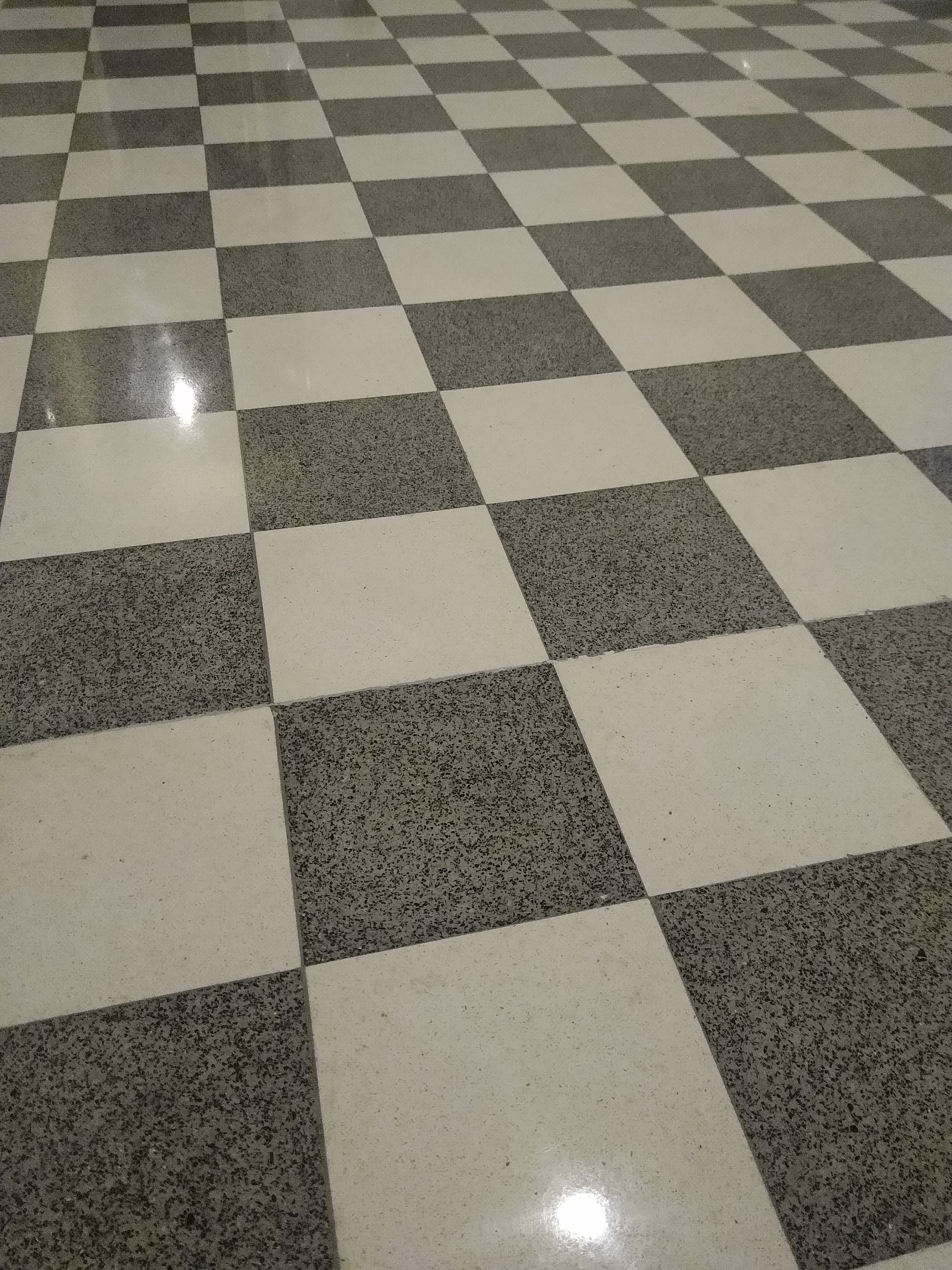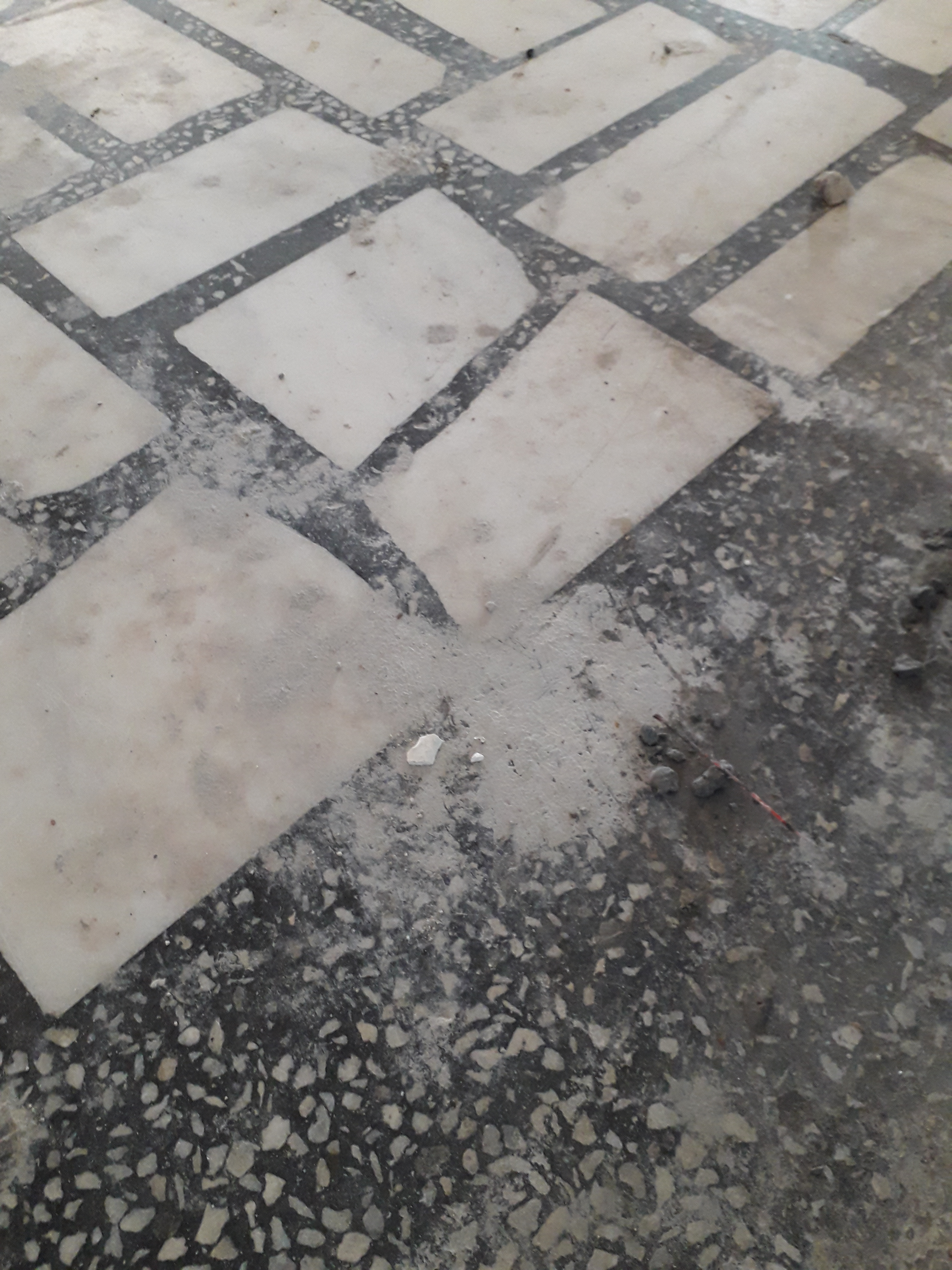Pardoseala din mozaic / cementine / terrazzo in imobil foarte vechi din Cluj, placi lipsa si refacute, finisaj lustruit :