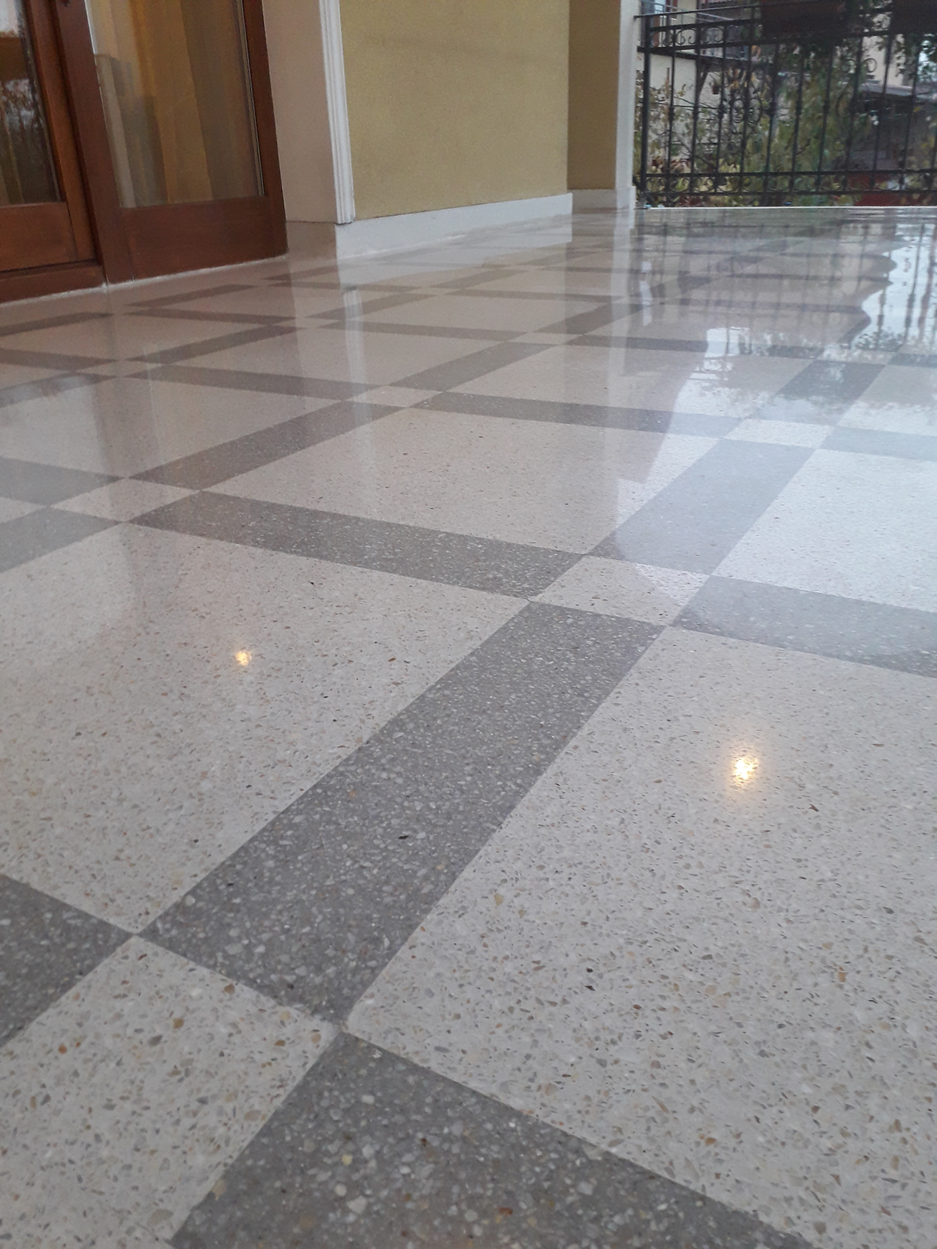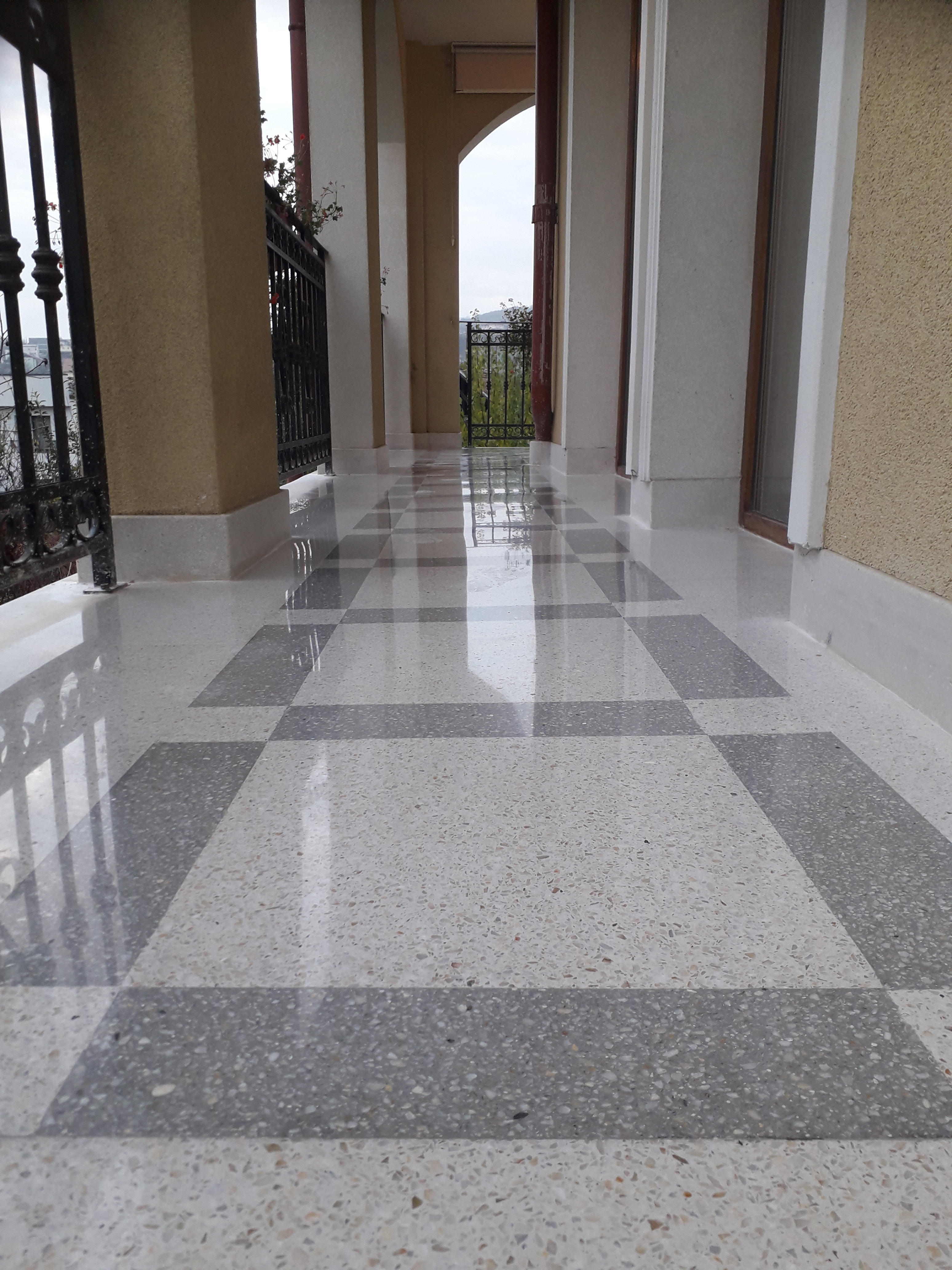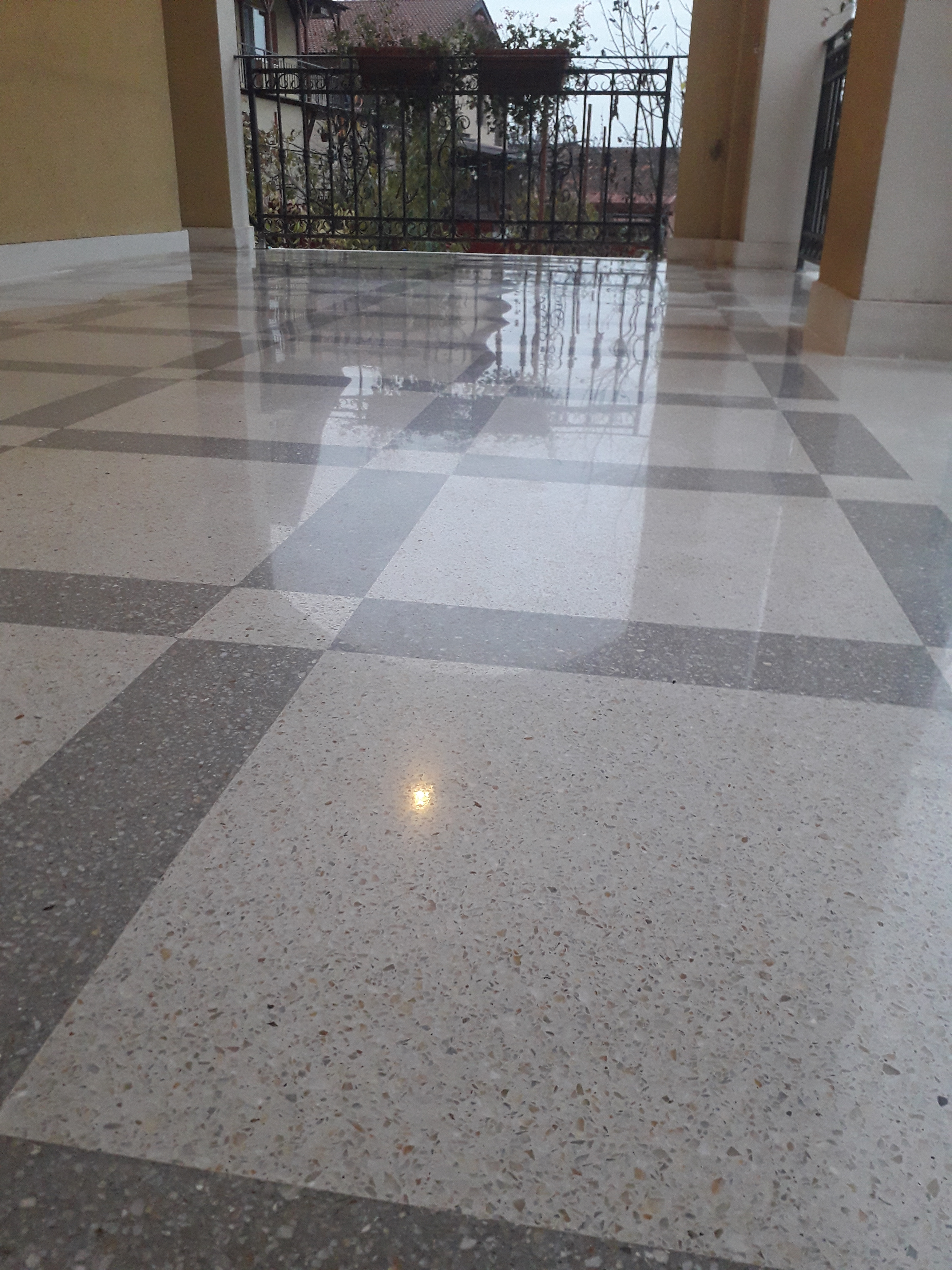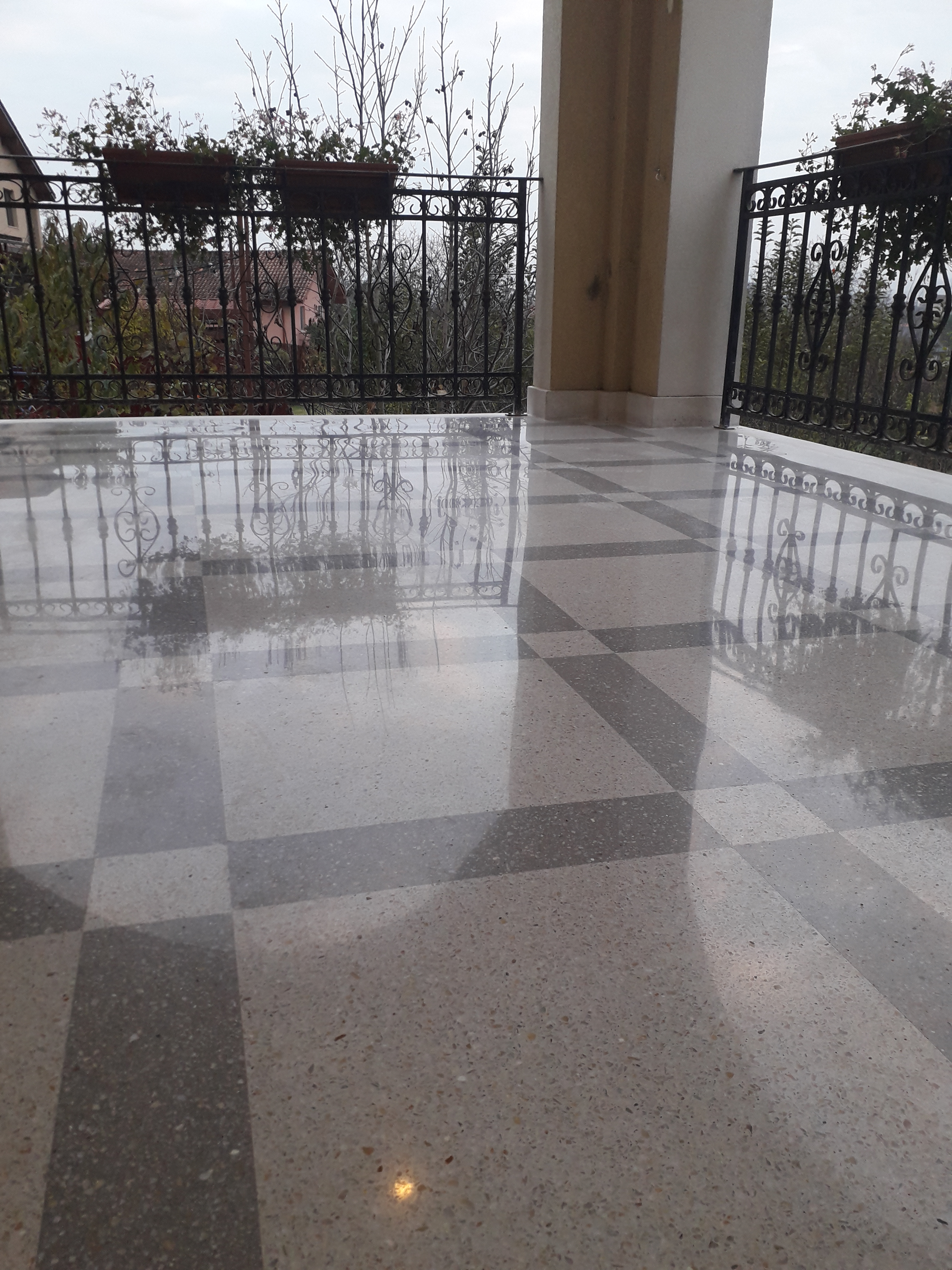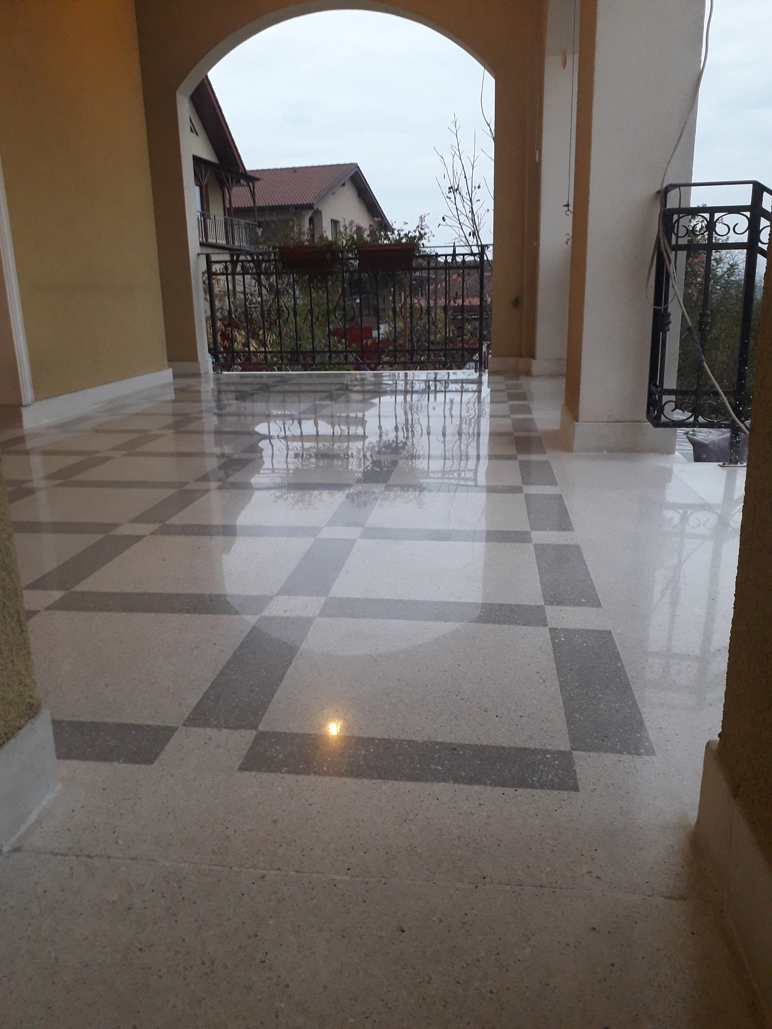 Exemplu de reconditionare pardoseala frumoasa din mozaic venetian, terasa exterioara, turnat la inceputul anilor 90. Adus la standarde actuale, slefuit complet, chituit, lustruit clasic (finisaj rezistent fara guard, ceruri sau chimicale) si impregnant de calitate italian :