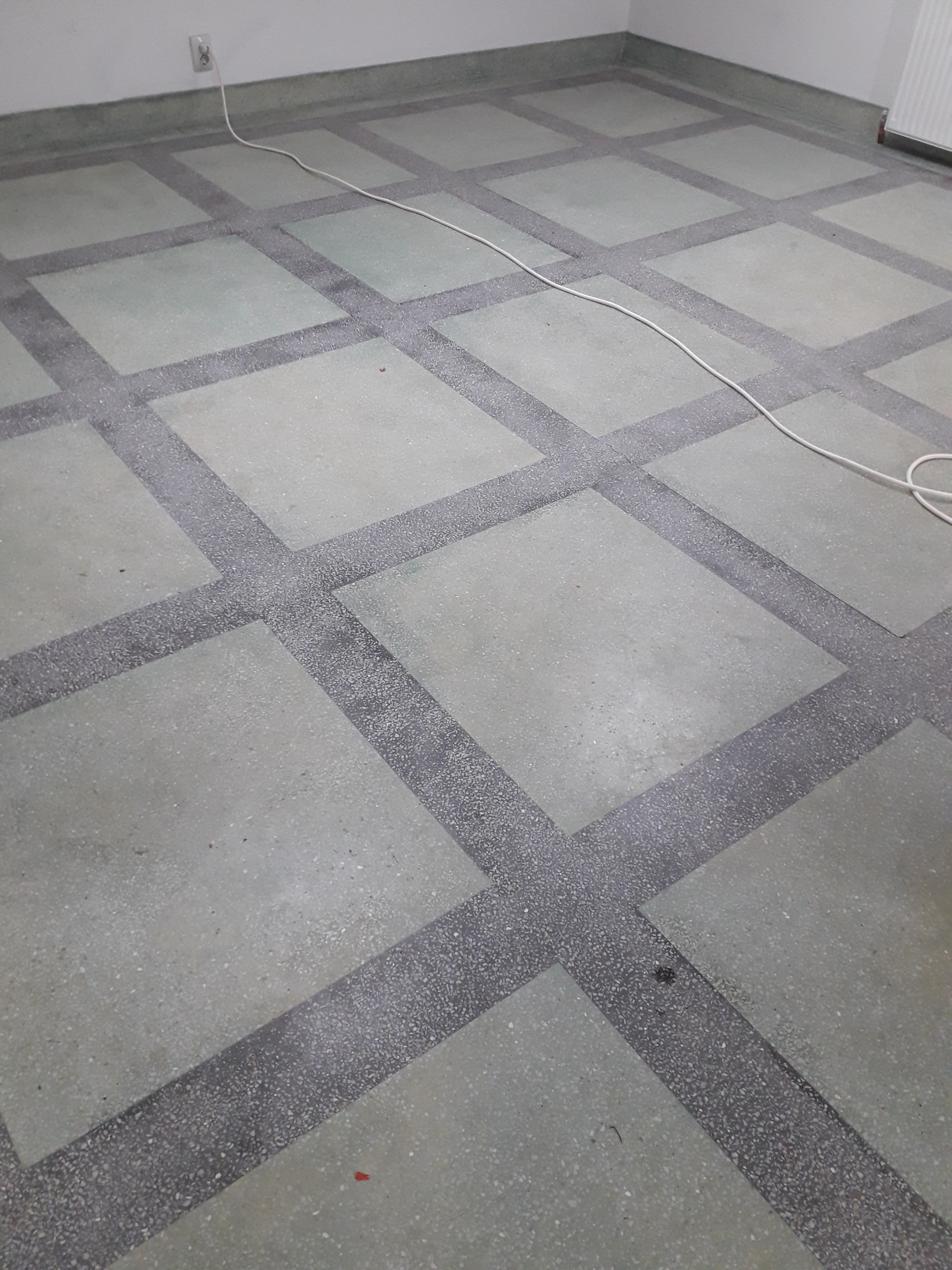 Mozaic alb, pardoseala veche reconditionata, slefuita si finisata lucios, urmata de tratament rezistent potrivit pentru garaj auto :